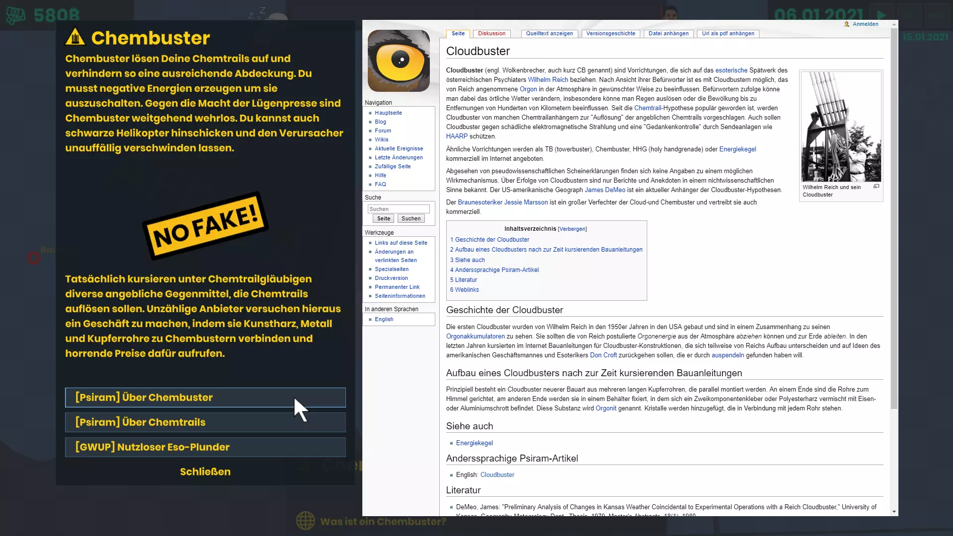 REPTRAILS当前版本使用指南 你好。 欢迎使用NWO远程化学凝结尾计划。鉴于当前情况,建议居家办公。我们受委托向你提供一款涵盖人口控制所有方面的程序。 正如你从较低的版本号中所看到的,目前仍缺少许多内容。该程序目前形式相对未经充分测试,你仍能非常容易地争取到民众的支持。 如果你发现错误,请告知我们。常见问题及解答汇总于我们的FAQ中。 您可以在此处了解计划内容的展望。 系统要求 目前支持的屏幕比例为16:9、16:10和21:9。 游戏需要配备双键和滚轮的鼠标。 我们测试电脑的规格:Windows 10、Intel Core i5-3570K 3.4 GHz或同等配置、8 GB内存、GeForce GTX 1080或同等配置、1 GB可用硬盘空间、使用游戏内浏览器时需联网(可选)。 最低可玩配置:Windows 10、Intel Core i3-7020U 2.3 GHz 或同等性能处理器 8 GB 内存 Intel HD 620 或同等性能显卡 1 GB 可用硬盘空间 使用游戏内浏览器时需联网(可选) 主菜单