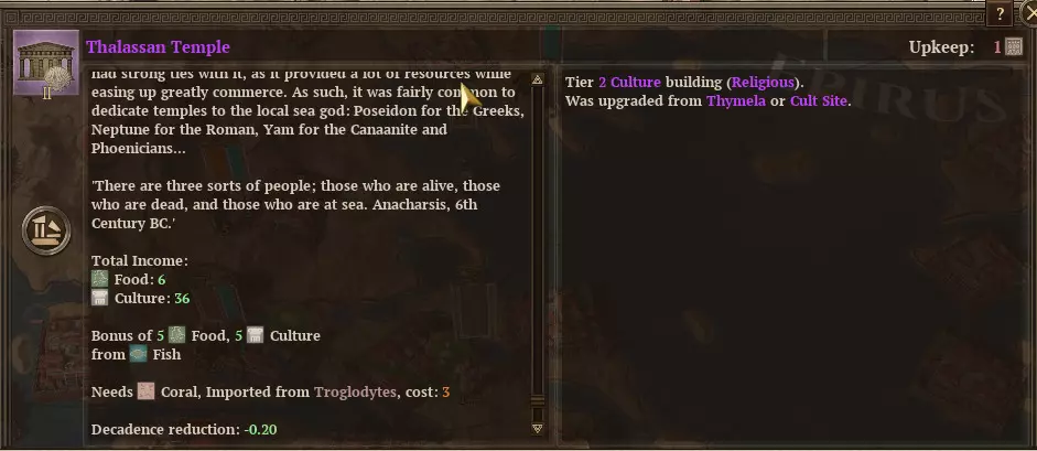 在一些人口最密集的地区,你需要建造此类建筑。 控制腐败值 有一些方法可以帮助你首先避免然后控制腐败值。 避免腐败值 这颇具挑战性,但如前所述,国家规模或许是最主要的影响因素。因此,在游戏中你必须进行扩张,但要谨慎行事。扩张的速度和范围都很重要——刚征服的地区会在短期内增加腐败值,而国家规模的扩大则会带来永久性的腐败值增长。 最佳建议是设定好自己的边界并坚守。如果可以,尽量打防御战;如果希望扩张,要尽快将地区整合为行省(单独的地区在规模计算中占1,而行省内的地区则占0.5)。控制方法 这里有4种工具: 1. 腐败值衰减 这一点很重要——如上图所示,每回合区域腐败值会减少10%。这使得游戏初期的纪念碑成为提升文化-腐败值比率的非常有用的方式。 2. 其他建筑 尤其是在文化建筑中的教育和司法子类中,你会发现许多能够减少腐败值的建筑。 这些建筑包括法院/监狱或导师屋/学校。希腊城邦还能建造海洋神庙,效果相当不错。