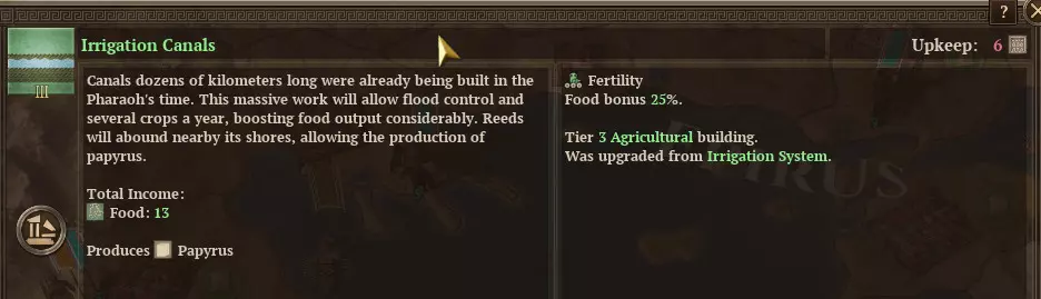 教育类建筑存在一个问题。你需要纸莎草,否则它们的成本会非常高。因此在游戏初期,在消除腐化和高昂成本之间进行权衡会比较棘手。 不过有一个解决办法。灌溉运河(一种三级农业建筑,由水井和灌溉系统升级而来)可以生产纸莎草。