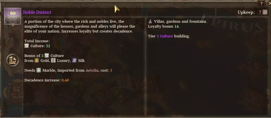 那是我帝国中最腐朽的地区。好在我有办法改善这种状况。 腐朽与忠诚度 在讨论如何控制腐朽(如果你能做到的话)之前,值得注意的是,一些三级文化建筑能提供大量忠诚度,但也会产生腐朽。 这些建筑包括角斗士场、竞技场、赛马场和贵族花园。下面的例子是在一个曾给我带来严重动荡问题的地区建造的贵族花园。