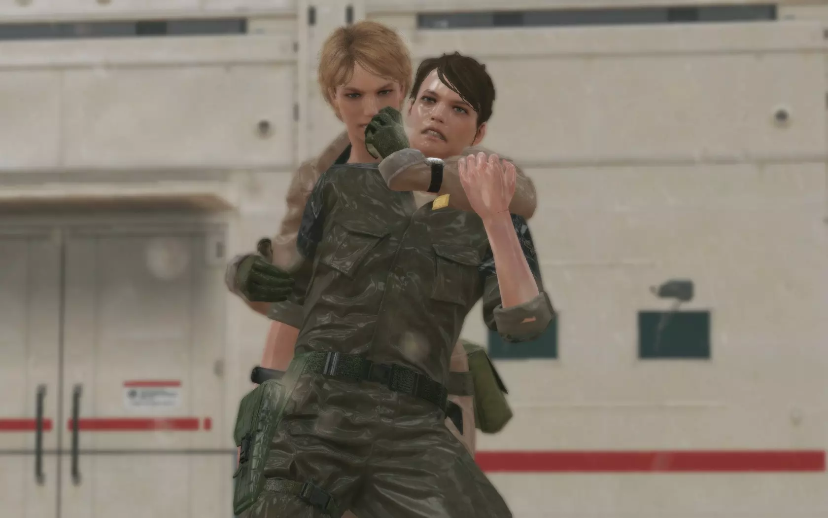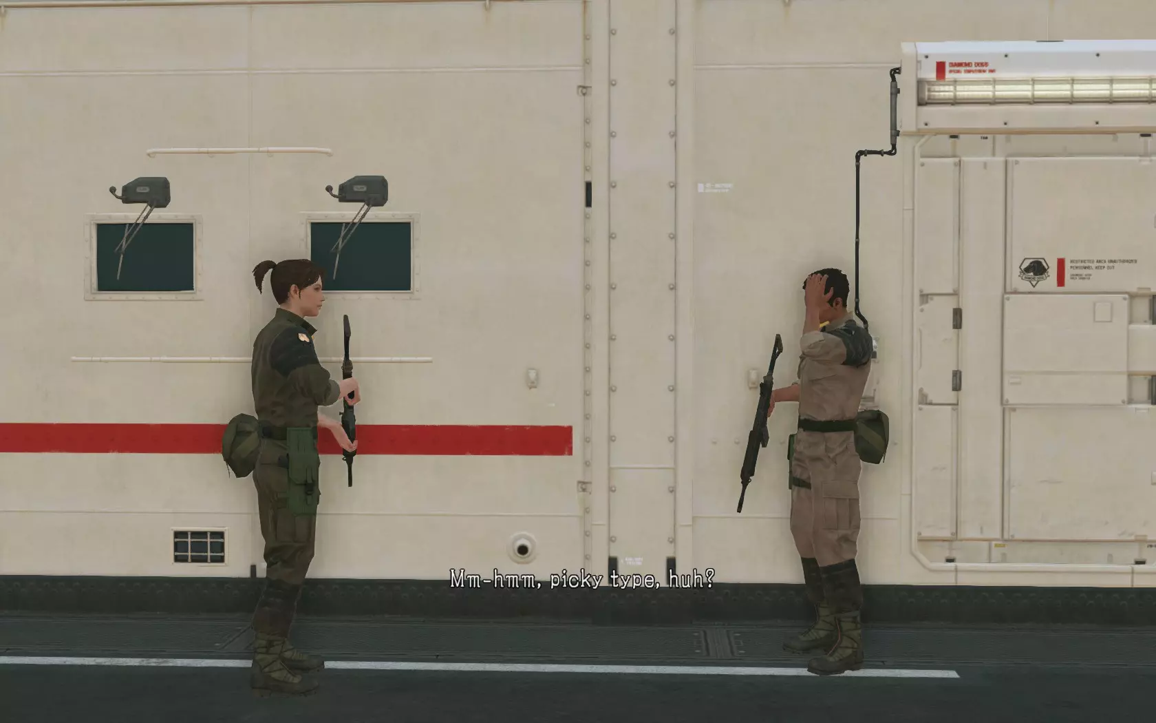 她们每次访问母基地只会交谈一次,所以如果你想再次听到这段对话,就必须重新拜访她们并重复步骤1到7。遗憾的是,这是你能听到女性 staff 说出的唯一一段独特对话。当然,《合金装备5:幻痛》在完成任务的方法上给了你很大的自由度,所以你也可以通过让整个平台/甲板都布满女性 staff 来获得相同的结果。不过这样做会更繁琐且耗时,因为你需要让一整个单位都填满女性 staff。