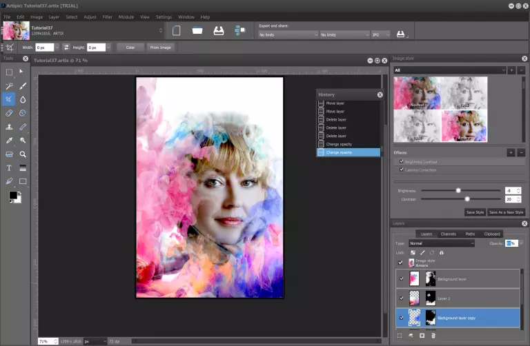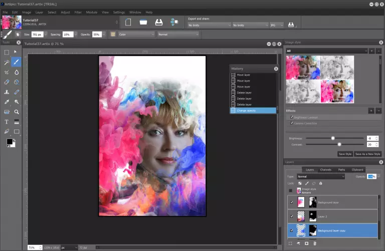 步骤4 将右侧和左侧纹理的不透明度分别降低至70%和60%,然后应用【Amaro】图像风格(在图像风格面板上)。
