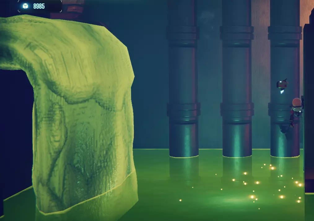 在第二个房间里,我们会遇到一个水池,水池右侧墙壁上藏着一个需要破坏的舱口。这条水下路径的尽头有一扇门,你可以想办法到达那里(量子跳跃和抓钩会有帮助)。但到了下一个阶段,仅靠这些还不足以到达第一个氧气补给点。 奖励:可乐糖浆+材料。 第二个位置位于游戏的第二张地图【实验室:基地层】。