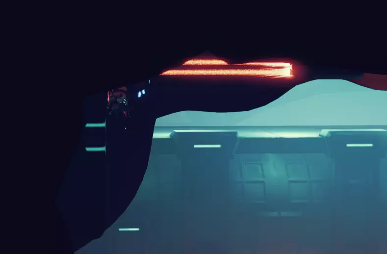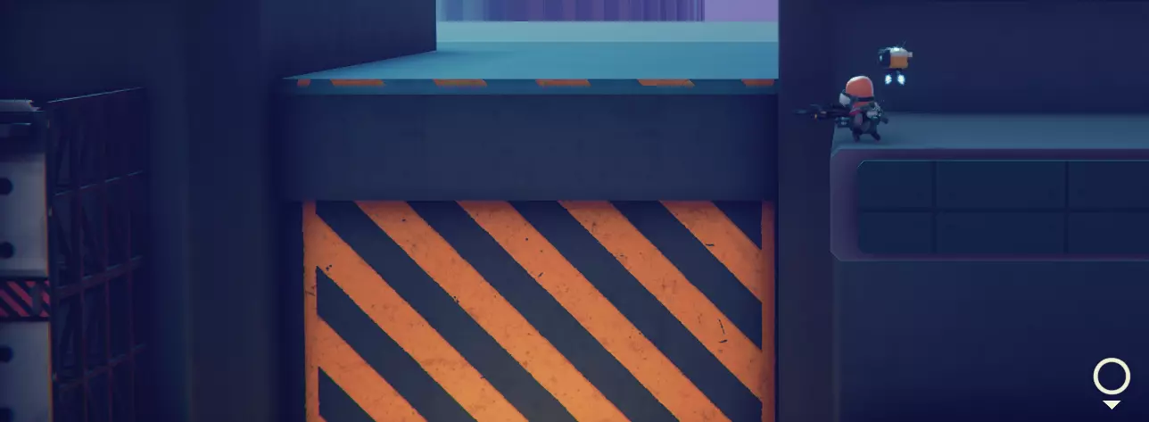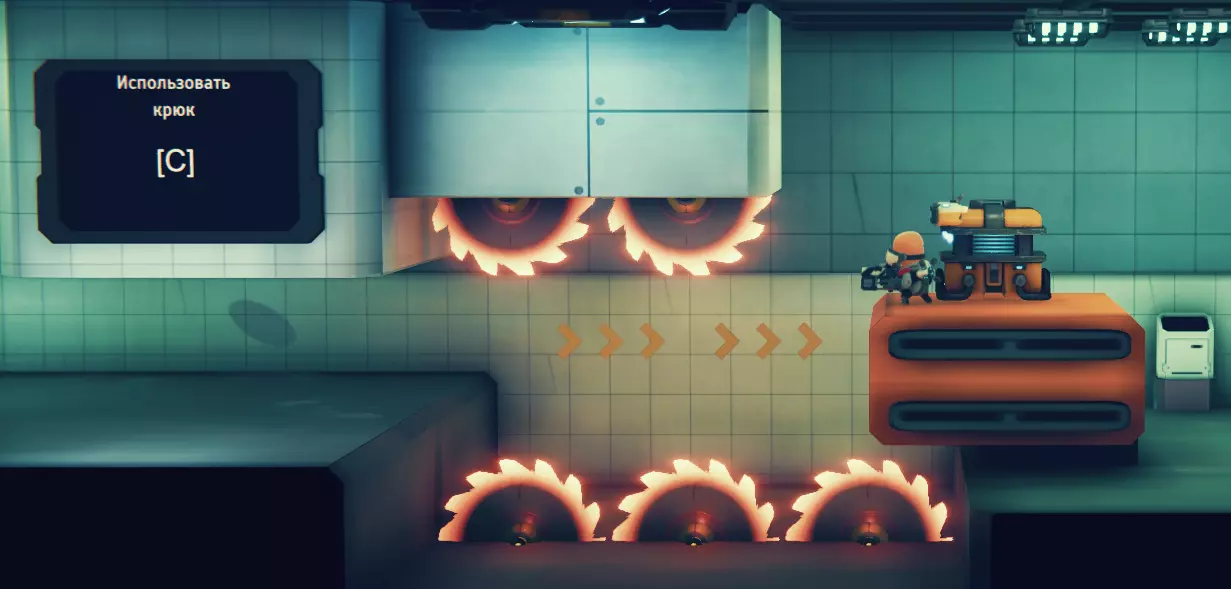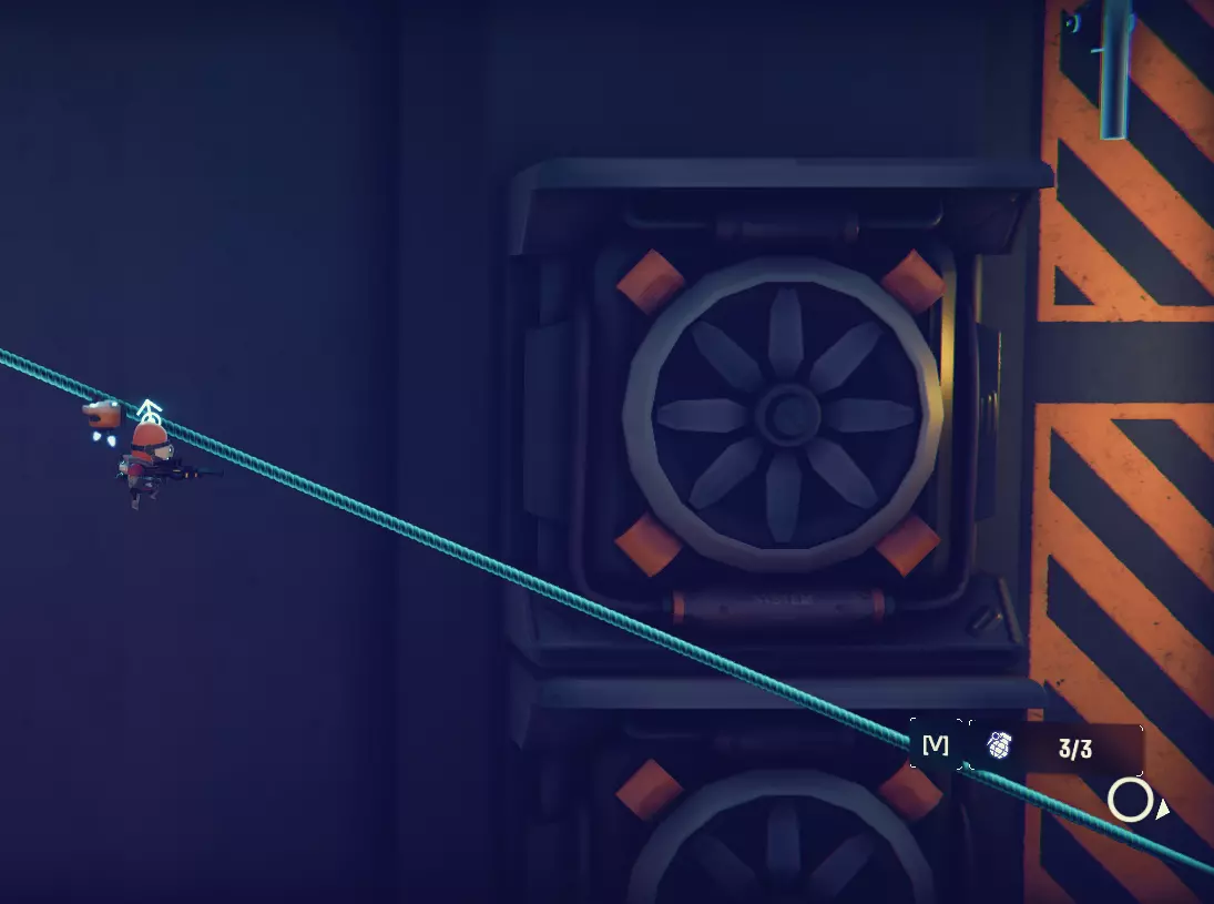 (就是这样) 在这之后你会进入一个需要消灭所有敌人的房间,这个关卡我们不感兴趣,不过下一个关卡需要格外留意,因为这才是我们要找的。 在即将离开房间的出口前,有一条索道,你无论如何都会滑过去。你需要在大约中间的位置停下来并向上跳,这时你应该会注意到一些透明的平台,这些是为抓钩准备的。(尽管游戏提示你向下走,但你应该看看右上角)