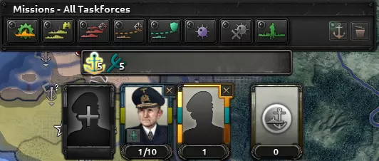 三大主要任务 巡逻:最重要的任务。通过在海域主动搜索敌方舰船(侦察)来获得制海权。随着时间推移,会根据舰船情况增加海军优势。会消耗大量燃料,因此主力舰与护航舰的比例需平衡在1:4-6。 打击舰队:适合大型海军。一旦巡逻队发现敌方舰队,打击舰队将提升海军优势并与敌方舰队交战。对于燃料消耗和大型舰队而言性价比高。 护航袭击:适合小型海军。会袭击敌方护航船队和舰队(取决于交战情况),以降低敌方海军优势。潜艇和护航舰效果最佳。 其他任务 海军演习:训练特遣舰队,提升舰船等级,从而增加其伤害,与陆军训练类似。此外,它还会提供大量海军经验。如果燃油不足,可以尝试让潜艇进行训练,因为潜艇消耗的燃油非常少。 护航:保护己方运输船队免受敌方舰船攻击。通常由驱逐舰执行。 布雷:布设水雷,可为你提供额外的制海权,增加敌方舰船随机沉没的几率,并使敌方舰船速度降低最高80%(!)。 扫雷:清除水雷,消除其影响。 海军入侵支援:为运送部队的运输船队提供护航。 海军目标选择:在这里你可以设置某支舰队是否不与潜艇或主力舰交战。如果你的舰队没有深水炸弹来对抗潜艇,这是个不错的选择。 原地待命:在当前位置保持静止。提供海岸炮击能力,可对敌方部队施加减益效果。旧版本玩法,1.16版本前。