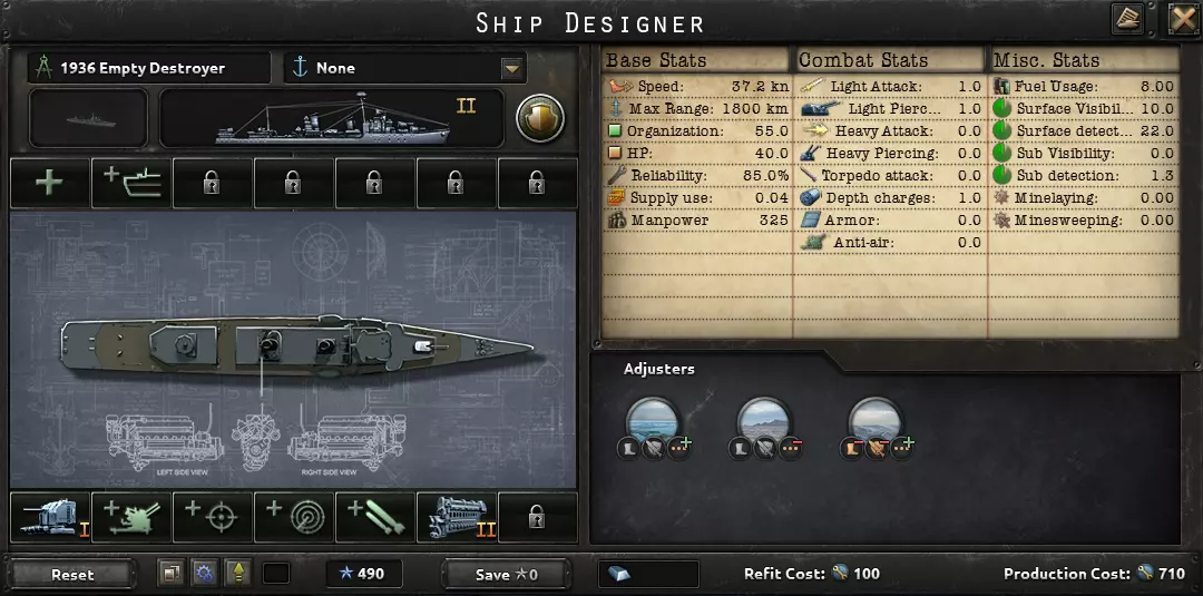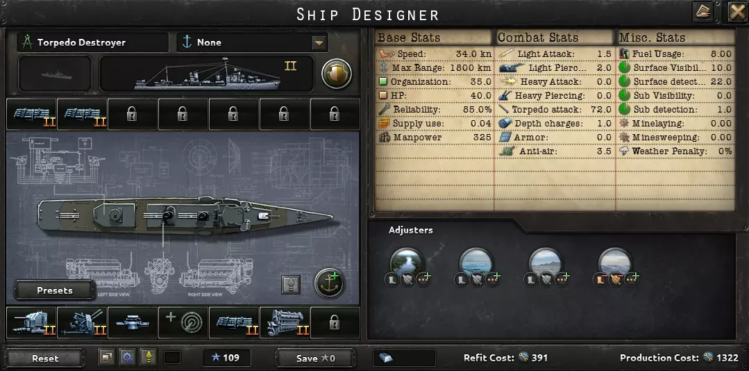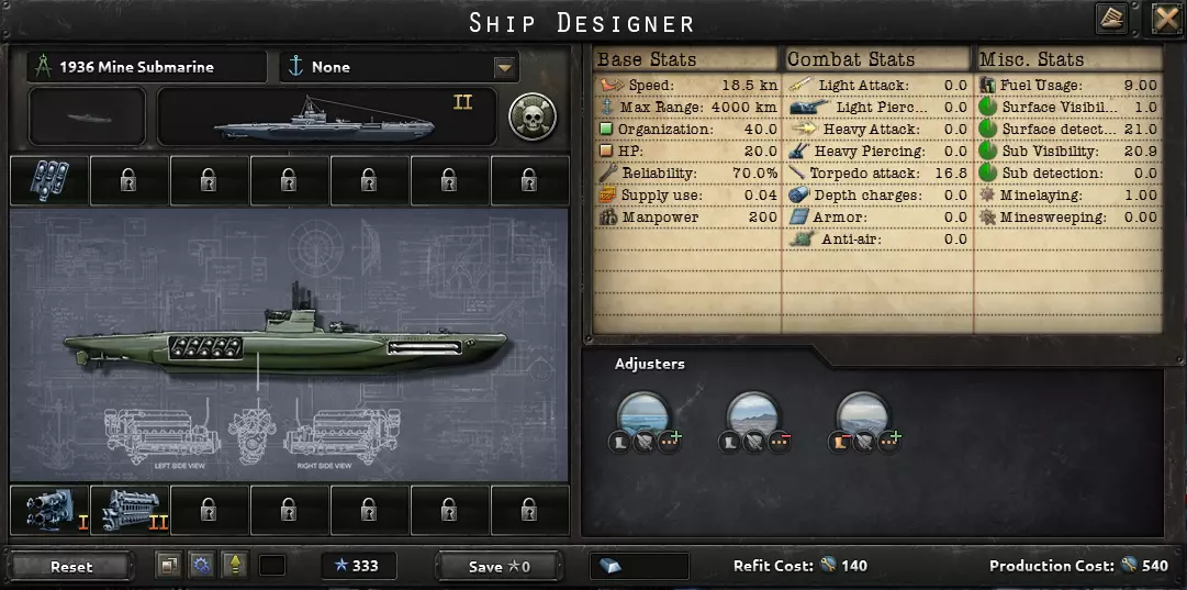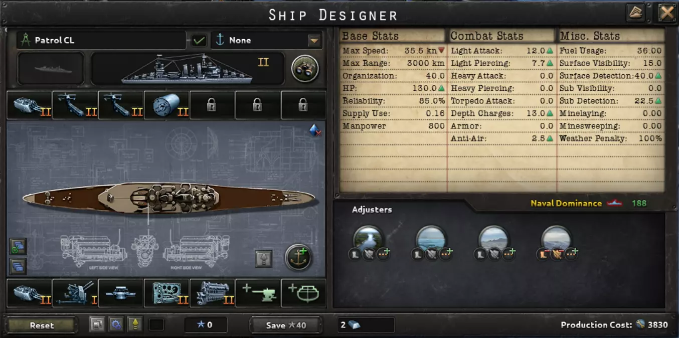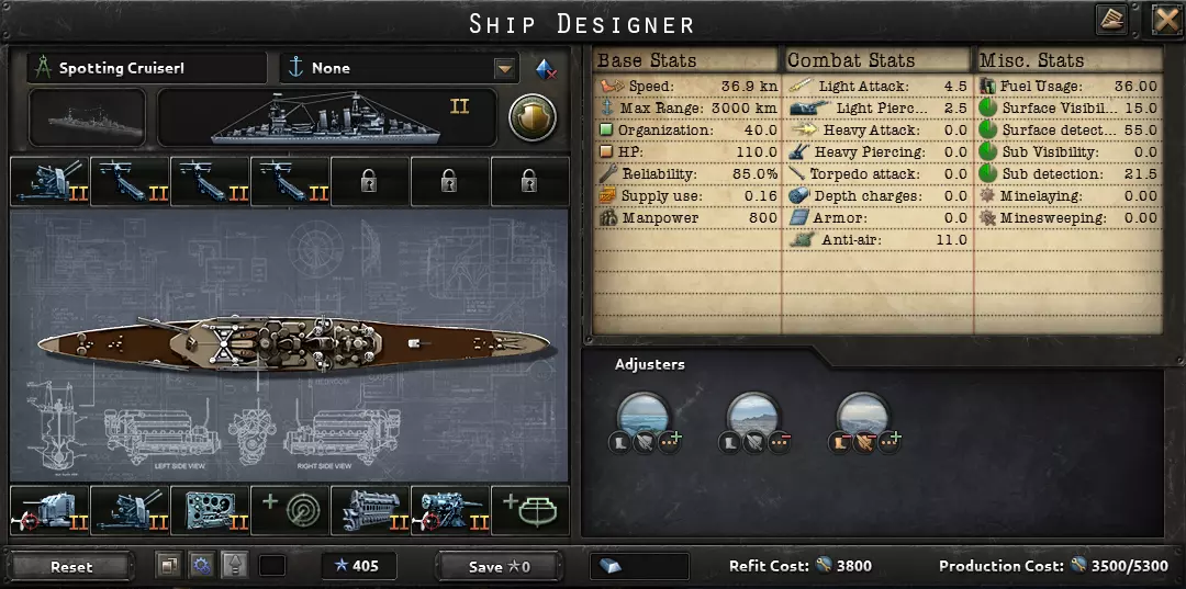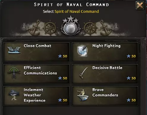 这句话完美描述了海军的用途:切断敌方补给线,并确保己方补给线安全。陆军和空军对战争的影响比海军更大。因此,大多数舰船都展示了1936年的舰船设计。大型舰船的建造周期也很长,你希望它们能在二战爆发前完工。真正有用的科技只有火控系统和潜艇船体;许多其他海军科技并不值得投入。你用海上飞机能取得更大成效,所以建造飞机,不要建造造船厂。