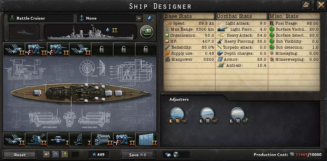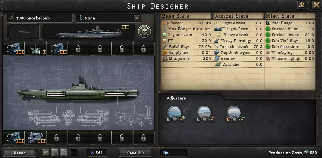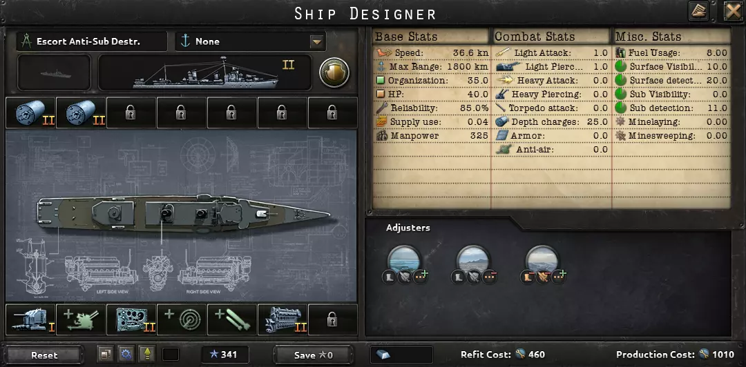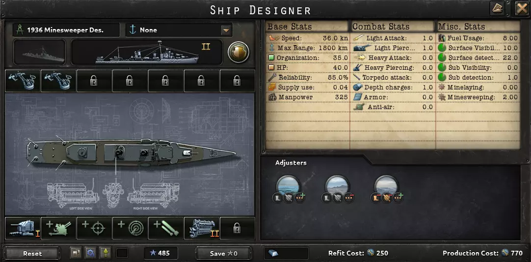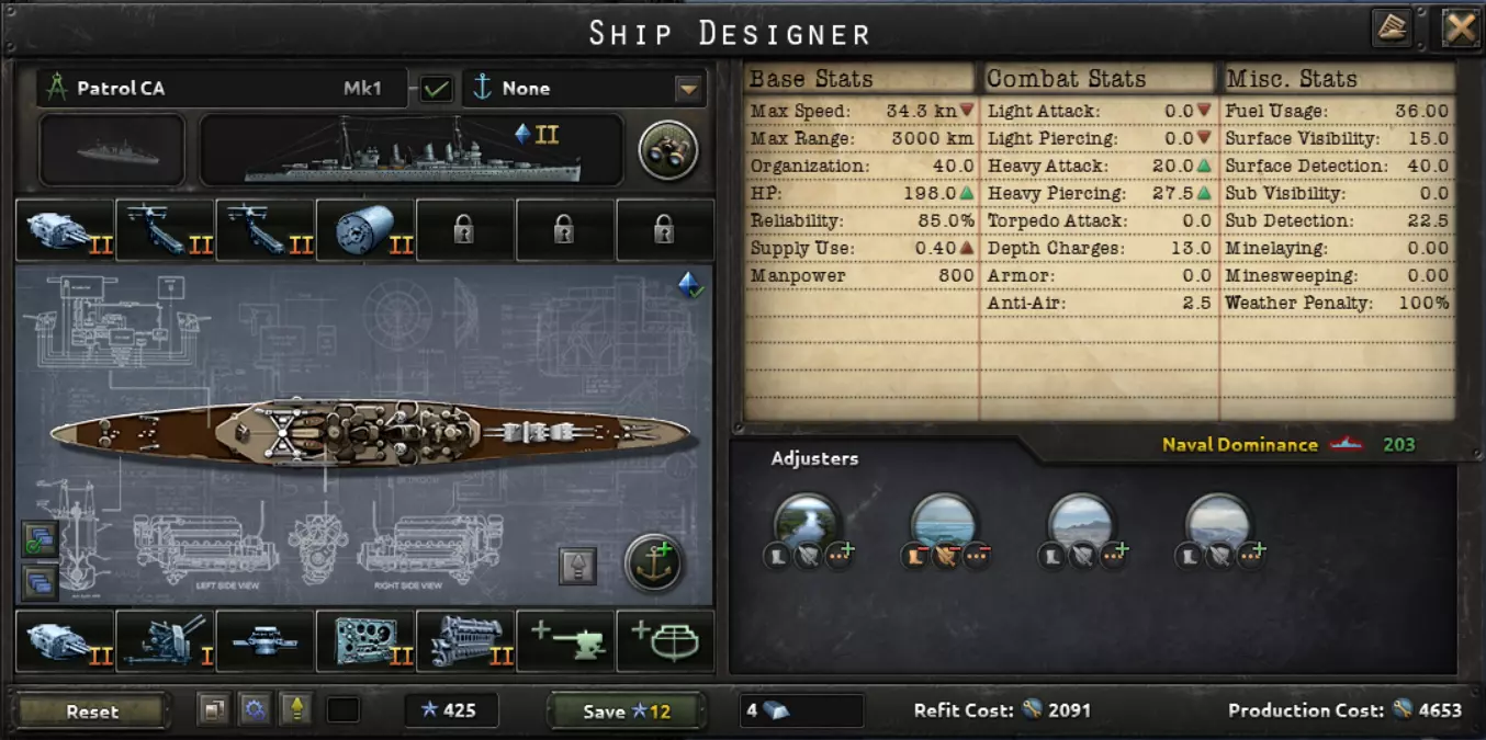 这句话完美描述了海军的用途:切断敌方补给线,并确保己方补给线安全。陆军和空军对战争的影响比海军更大。因此,大多数舰船都展示了1936年的舰船设计。大型舰船的建造周期也很长,你希望它们能在二战爆发前完工。真正有用的科技只有火控系统和潜艇船体;许多其他海军科技并不值得投入。你用海上飞机能取得更大成效,所以建造飞机,不要建造造船厂。