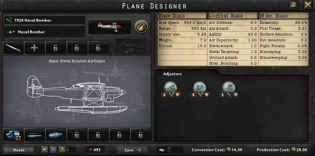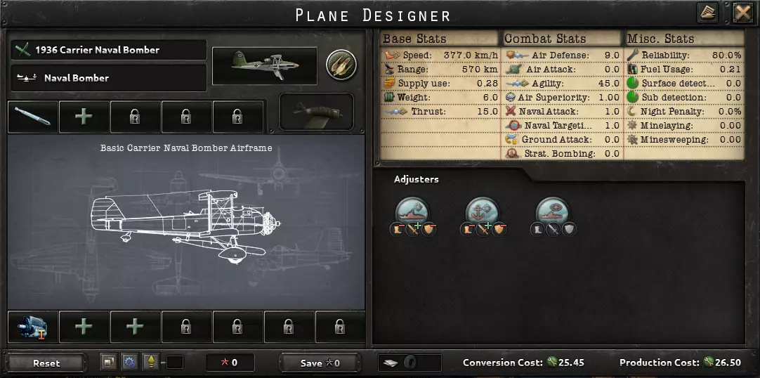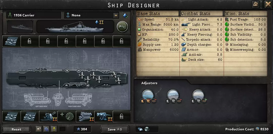 航空母舰是性价比最高的舰船。即使你初始海军规模较小,也应该建造4艘!无需配备装甲,因为它们在后方作战。防空武器有助于击落敌方(舰载)海军轰炸机,并减少由此受到的伤害。不需要雷达或火控系统,因为这些属性对舰载机毫无作用。为追求最大作战效果,你的航母应仅搭载海军轰炸机。1936年舰载海军轰炸机