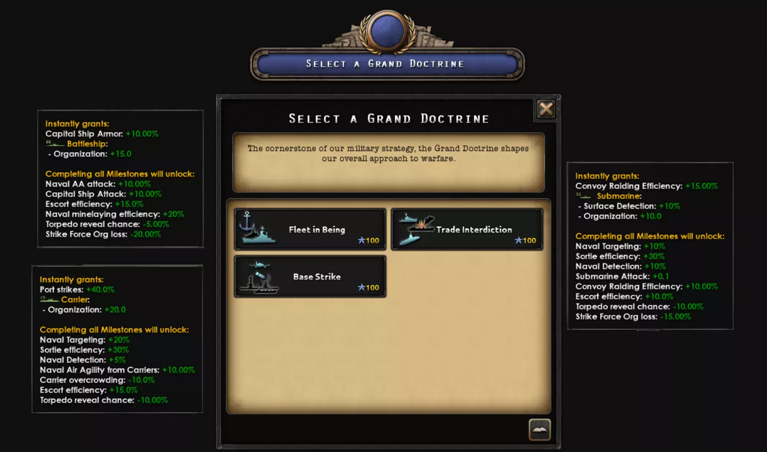 选择何种学说取决于你希望舰队发挥的作用。 你计划打造尽可能强大的打击力量?选择【存在舰队】学说。 你只有潜艇或驱逐舰,且根本没有机会消灭敌方海军?选择【贸易拦截】学说。 你想依靠飞机和航母消灭敌人?选择【基地打击】学说。 这一选择虽不像1.17版本前那般重要,但有助于你为子学说做好准备,并在战争初期提供不错的增益。 潜艇
