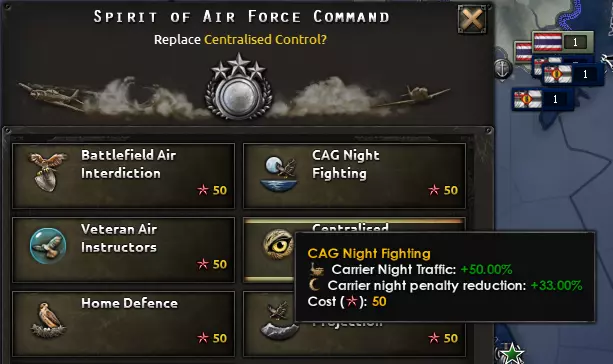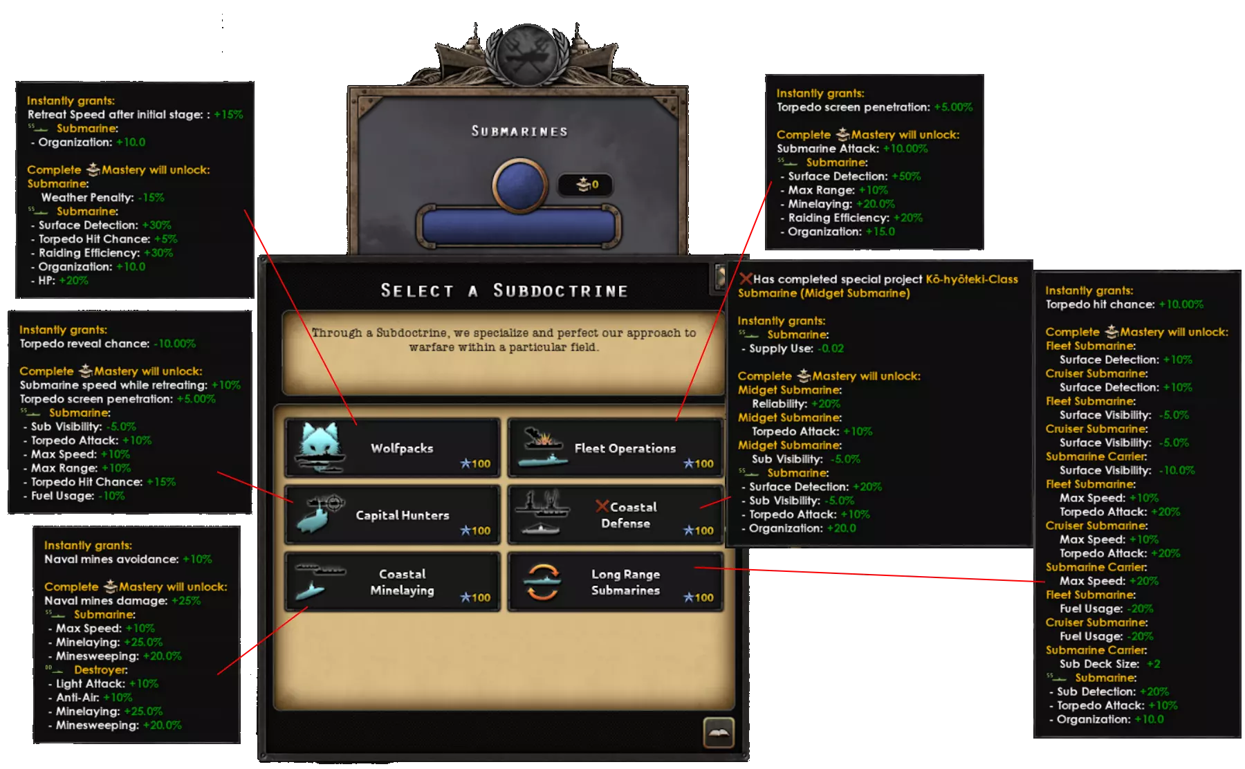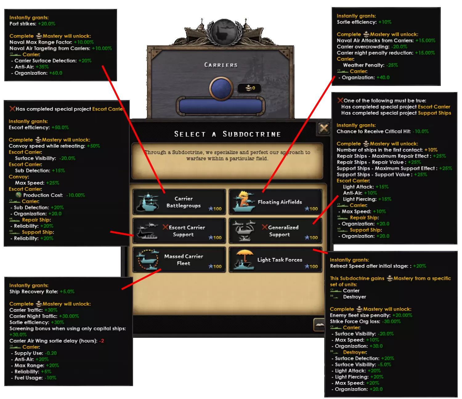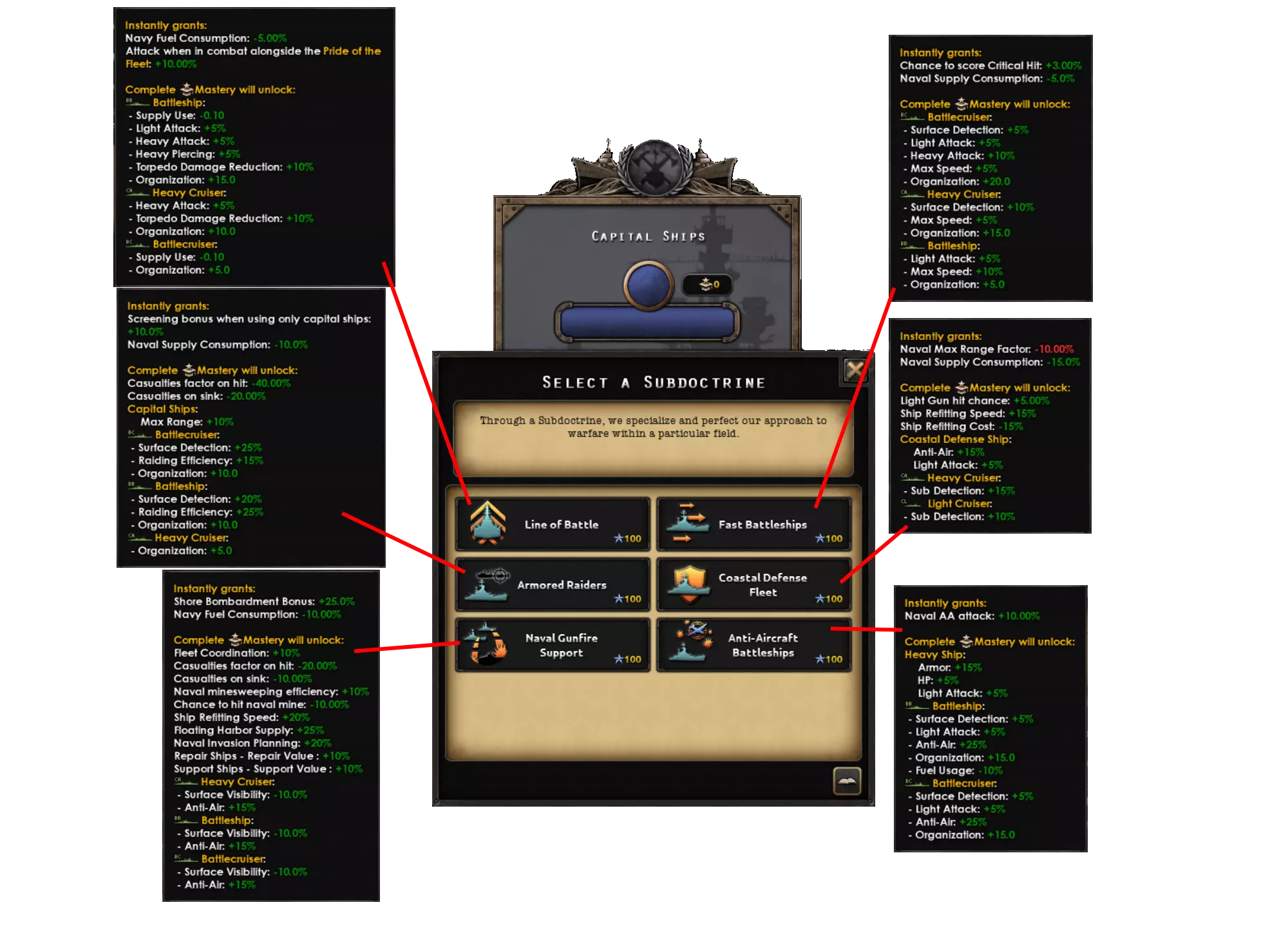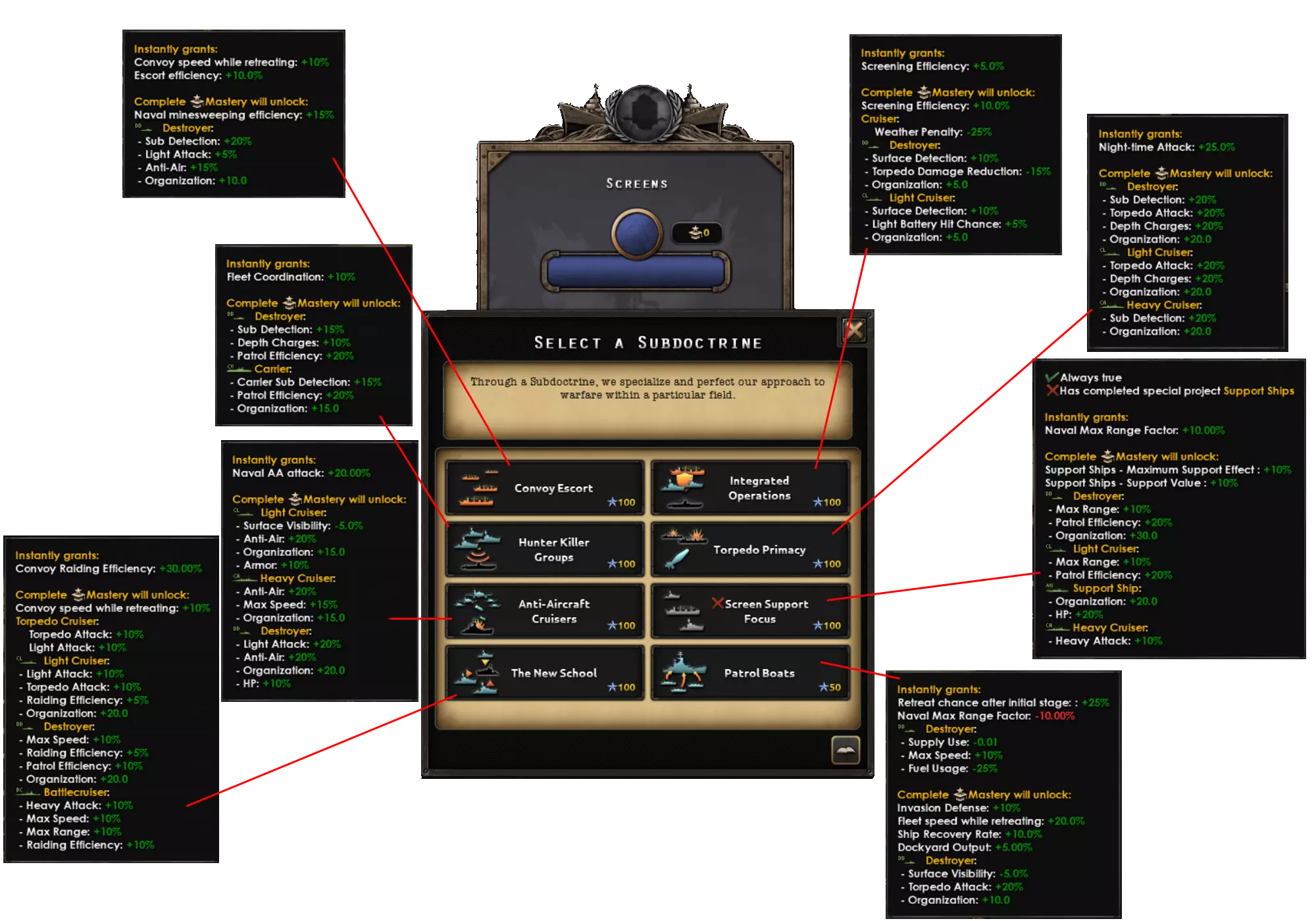 此设计使用了机枪,因为中型机体的主武器不能是鱼雷。因此,使用蓝星增援选项,该选项只允许完全相同的机型进行增援。这种设计的主要优势在于航程;它比小型机体的航程要长得多。你可以添加模块进一步增加航程,但通常1000公里或以上的航程足以应对大多数海域。 学说与精神 1.17版本带来了全新的学说系统,使其更能灵活满足海军的需求。