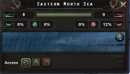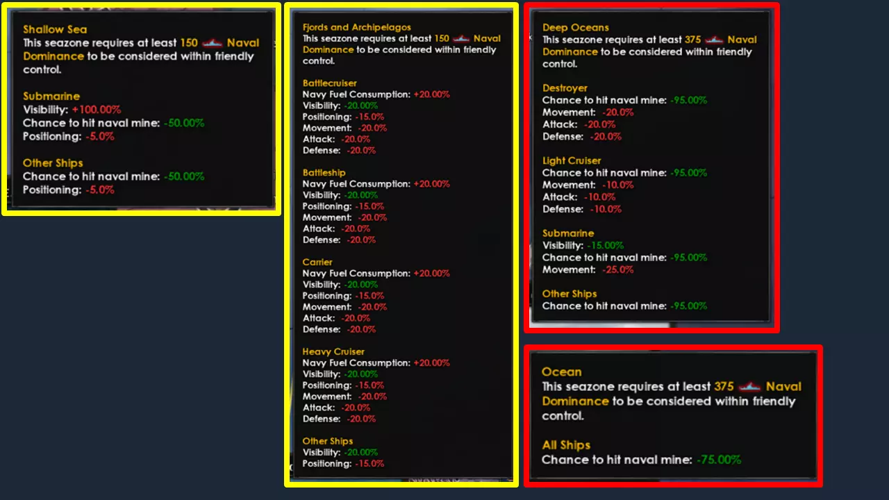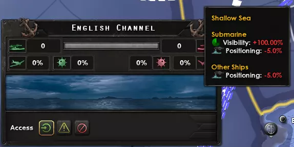 确保海军上将的特质与其目标相符;这位海军上将是要指挥打击舰队,还是潜艇舰队? 一些值得注意的海军上将特质: 隐蔽专家是最优秀的特质;它能提供-20%的可见度,大幅降低被击中的几率。对于被轻型火炮瞄准的驱逐舰,被击中的概率降低约33%。对于被重型火炮瞄准的战列舰,被重型火炮击中的概率降低约10%。额外的好处是,敌方舰队更难发现你。 勇猛非常出色,它能提供5%的额外伤害和10%的额外速度(相当于额外生命值)。 战术家能提供25%的定位加成,这对打击舰队相当有用。【观察员】特性可提供额外的索敌速度,就索敌加成而言,这个数值相当可观。 地形特性,例如【远洋专家】,只要海军将领在其专长的地形中作战,效果就会非常出色。 对于提升潜艇对护航舰队的伤害输出,【海狼】、【静默猎手】、【装填训练大师】和【鱼雷专家】(按此顺序)是极佳的特性。 地形与天气 海军地形对海战中的双方都会产生同等影响。 天气也是如此;天气惩罚会同时作用于双方! 恶劣天气主要影响舰载机,因此当你与敌人在航母方面存在优势或劣势时,天气因素尤为重要。不过,你无法时刻查看天气,所以天气通常是海战中的一个随机因素。使用潜艇时,你需要注意以下几种地形类型: - 浅海会使潜艇的可见度提升100%(!!) - 峡湾和群岛会使所有舰船(包括潜艇)的可见度降低20% - 深海会使潜艇的可见度降低15%