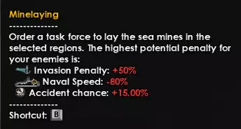 此设计旨在造成最大的深水炸弹伤害,以实现最佳的成本效益。它不擅长探测潜艇,仅擅长消灭潜艇。将此舰用作护航舰队或打击部队:每个海域配备1艘舰只,足以驱逐敌方潜艇。用作打击部队时,将它们编成5艘一组(任何规模均可),然后让它们以中等风险参与战斗。 布雷与扫雷 完全饱和的雷区会给敌人带来诸多惩罚:
