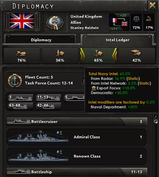 一定要获取这项升级! 情报效率会对水面探测和潜艇探测产生倍率影响: 在0%情报时为0.5,随情报提升而增长, 在40%海军情报时达到1.0。获取情报对于侦察至关重要! 提升海军情报的方法: 在目标国家建立间谍网络(最高40%,需要间谍网络覆盖该国港口) 执行“渗透海军”间谍行动 破译敌方密码(常规提供10%,激活时可在30天内提供50%) 在任何敌方海域部署雷达 使用侦察机 升级“海军部”(可为海军情报总值提供1.25倍修正)