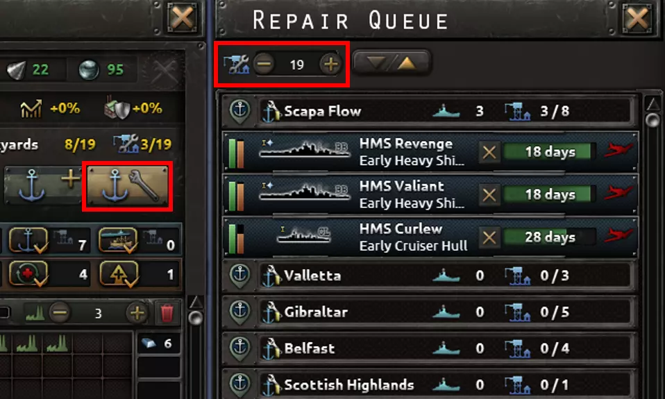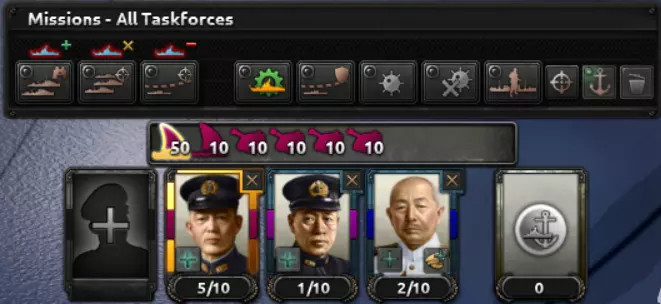 游戏开始时,使用快捷键G将所有舰船合并为一个舰队。 若想高效利用燃料获取海军经验,应优先训练潜艇,其次是驱逐舰,最后是主力舰。使用Shift+K进行海军演习直至训练完成。 将潜艇分离出来,交由单独的海军上将指挥。使用快捷键D将潜艇拆分为更小的编队。 其他所有舰船应作为打击舰队使用,将其设置为特定海域的打击舰队。如果该打击舰队中的航母数量超过4艘,就将多余的航母部署到其他地方。 分离出适合侦察的舰船,让它们执行侦察任务。 将一些装备深水炸弹的驱逐舰交由单独的海军上将指挥,执行护航任务。使用快捷键H将舰船召回港口,或使用快捷键Ctrl+H让舰船停留在当前位置。 仔细检查每个特遣舰队的交战风险。 自动分遣功能对所有特遣舰队都非常有用;但如果仍需进行决定性海战,请关闭该功能。 使用战斗机(或其他飞机)来提升基地侦察和制海权。飞机提供的基地侦察没有数量限制! 优先发展陆军和空军;它们比海军更具影响力。如果没有石油资源,不要让海军进行训练(或训练至完成即可)。这样民用工厂就可以用来建造工厂,而不是用于石油贸易。
