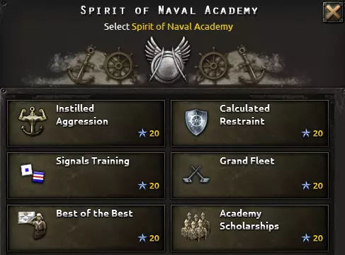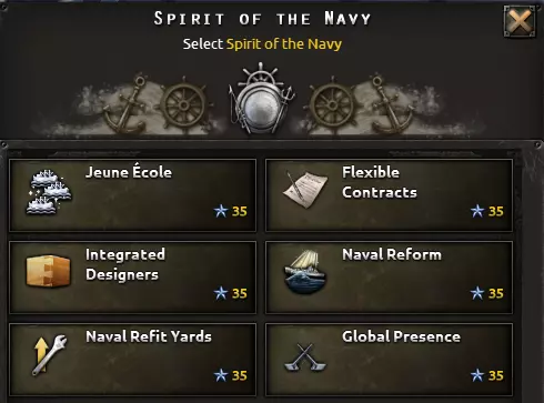 海军精神的种类相当多样;根据具体情况,它们都可能发挥良好作用。【海军改装厂】是最全面的选择;在进行舰船改装或维修时,应当选择这一精神。