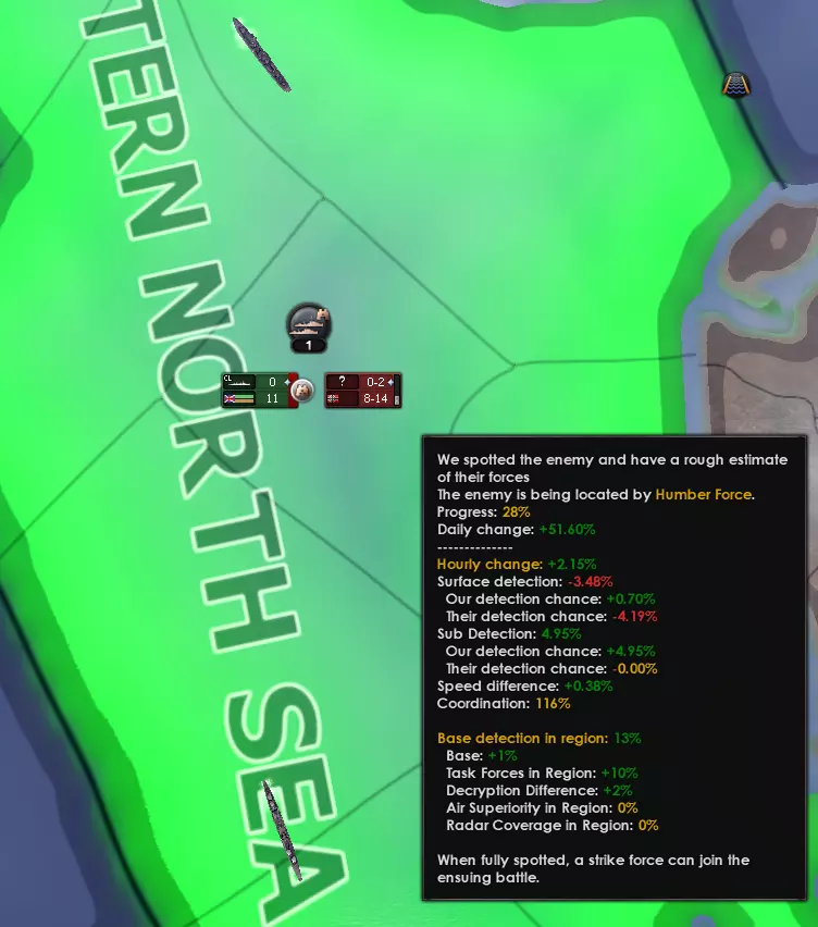 基础探测 基础探测决定开始发现目标的百分比阈值。此数值越高越好。 基础探测由以下因素决定: - 基础探测值(10%) - 在该海域执行任务的友方舰船数量 - 海军情报差异 - 友方制空权:对上述所有因素起到乘数作用(最高为2) 每小时变化 影响“每小时变化”的因素包括: - 情报效率:最重要的属性! - 潜艇探测 - 水面探测 - 潜艇可见度 - 水面可见度 所有这些数值均为巡逻舰队的平均值;这就是为什么建议只使用1艘侦察巡洋舰,而不搭配其他舰船。潜艇探测属性难以获取,但每点的效果(6倍)比水面探测更显著。 情报效率