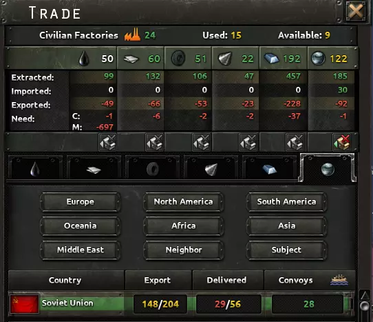 通过更改通行权限来控制你的护航舰队贸易路线!否则,护航舰队将始终选择最短路线。 使用护航任务保护你的护航舰队。你的舰船将: 1. 驱逐任何攻击你护航舰队的护航袭击舰。 2. 击沉攻击你护航舰队的敌方舰船。 你可以使用任何舰船(最好是闲置的驱逐舰,任何舰船都能驱逐潜艇)执行护航任务,但要实际击沉它们(尤其是1940型潜艇),你需要一支专门的部队。 你必须先发现潜艇才能击沉它们! 击沉潜艇(尤其是1940型潜艇)的最佳方法是使用一艘侦察巡洋舰作为侦察特遣队,配合装备深水炸弹的驱逐舰。或者,使用包含1艘或多艘航母的小型打击舰队(因为航母也能消灭潜艇)。如果你主动发起交战(发现潜艇后),潜艇会完全暴露并变得脆弱。但当你派遣护航舰进行防御时,潜艇会在你的舰船抵达后迅速隐蔽,之后便无法被攻击。 海军轰炸机同样擅长消灭潜艇。 1936年护航驱逐舰