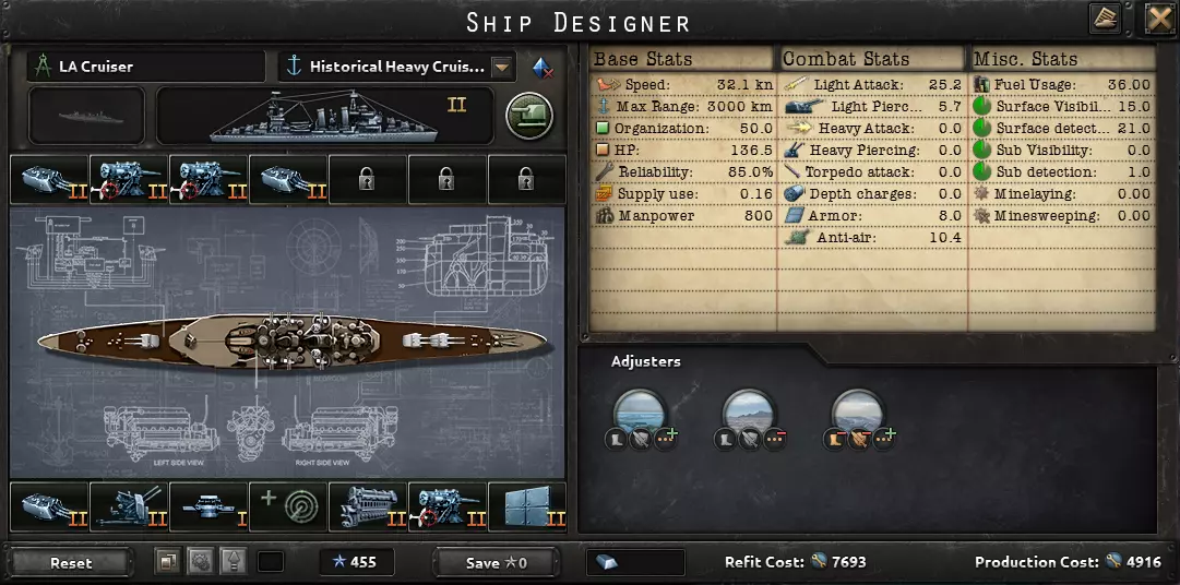 侦察机母舰和水听器用于探测执行巡逻任务的敌方舰船,而火炮和鱼雷则用于造成伤害。如果需要,可以随意用深水炸弹替换火炮。拆除声呐和防空武器以节省生产成本。该设计成本较高,因此如果可以的话,建议用轻巡洋舰替代。 侦察巡逻重巡洋舰