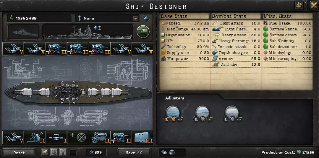 如果你受《伦敦海军条约》限制,无法建造超重型战列舰,那么可以改建战列舰。在此,我们采用战列舰装甲II型;装甲越厚,受到轻(重)型火炮的伤害就越少。这些舰船配备双联装两用副炮II型;英国、法国、美国、日本这几个国家初始就拥有1939年这项技术。 1936超重型战列舰