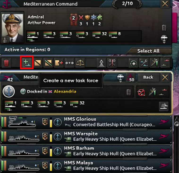 让我们开始指南! 术语 CA = 重巡洋舰(配备重型主炮的巡洋舰船体) CL = 轻巡洋舰(配备轻型主炮的巡洋舰船体) CV = 航空母舰(航空母舰船体) BB = 战列舰(配备战列舰装甲的重型舰船船体) BC = 战列巡洋舰(配备战列巡洋舰装甲的重型舰船船体) DD = 驱逐舰(驱逐舰船体) SHBB = 超重型战列舰(超重型船体) 屏卫舰 = 位于屏卫线/前线的舰船 海军任务 当你按下F2键时,海军界面将会弹出。虽然这个界面乍一看可能有些复杂,但使用海军实际上比使用陆军更容易,因为如果设置得当,它不需要任何额外的照料。 快速概述: 每个海军上将最多可以指挥10支特遣舰队。 每个海军上将都有指定给他们的特定海域。每个特遣舰队会在所有那些海域执行任务。