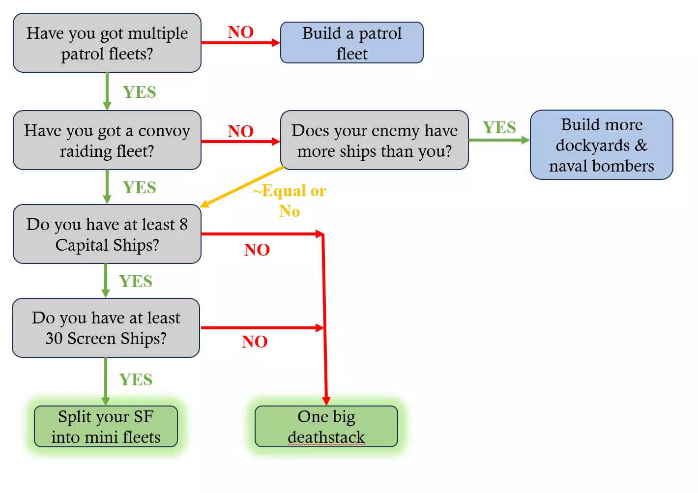 大型死亡舰队 将你的死亡舰队部署在争夺最激烈的海域,确保该海域有巡逻舰队在行动,且它们的母港就在附近。 理想情况下,保持1:1:4-8的比例配置:1艘航母、1艘重型舰船(战列舰、战列巡洋舰或重巡洋舰)搭配4艘轻巡洋舰或8艘驱逐舰。如果轻巡洋舰或驱逐舰数量不足,不要派出你的打击舰队。 多支打击舰队 像日本、意大利、美国和英国这类国家,拥有多个存在争夺的海域,需要时刻掌控这些区域。同样,要确保在所有部署了打击舰队的海域都有巡逻舰队在行动。 遵循之前1:1:4-8的比例,不过如果航母数量不足,可以调整重型舰船和屏卫舰船的比例。以下是一些建议: 2艘航母:4艘重型舰:12艘轻巡洋舰或24艘驱逐舰 2艘航母:6艘重型舰:24艘轻巡洋舰或48艘驱逐舰 4艘航母:6艘重型舰:24艘轻巡洋舰或48艘驱逐舰 4艘航母:8艘重型舰:32艘轻巡洋舰或64艘驱逐舰 唯一真正的限制是比例和打击部队的舰船速度(最低20节) 额外添加3或6艘屏卫舰,以便在有一艘屏卫舰被击沉时保持比例。 1936年航母
