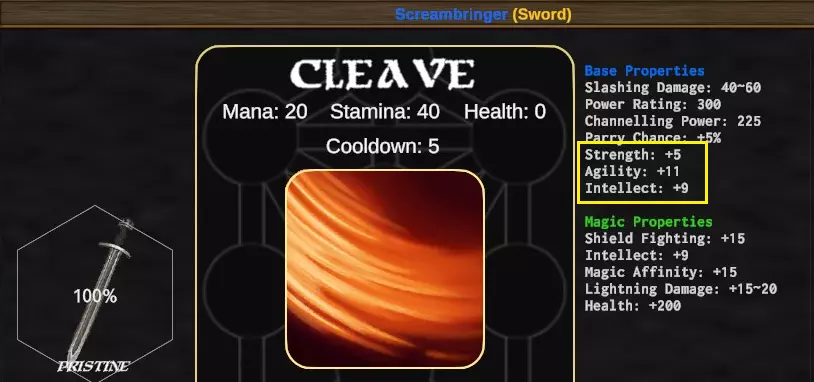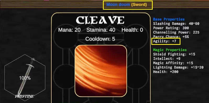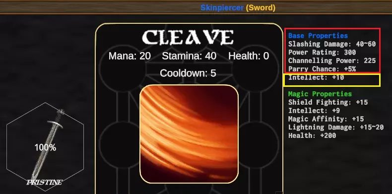 红色方框标记的基础属性无法重铸,魔法属性同样无法重铸,若要更改这些属性,你需要制作新的装备。黄色方框标记的部分是可以重铸的属性。 这是重铸后的同一把剑,注意【智力+10】已变为【敏捷+7】,装备名称也发生了变化,但这只是装饰性的改动。
