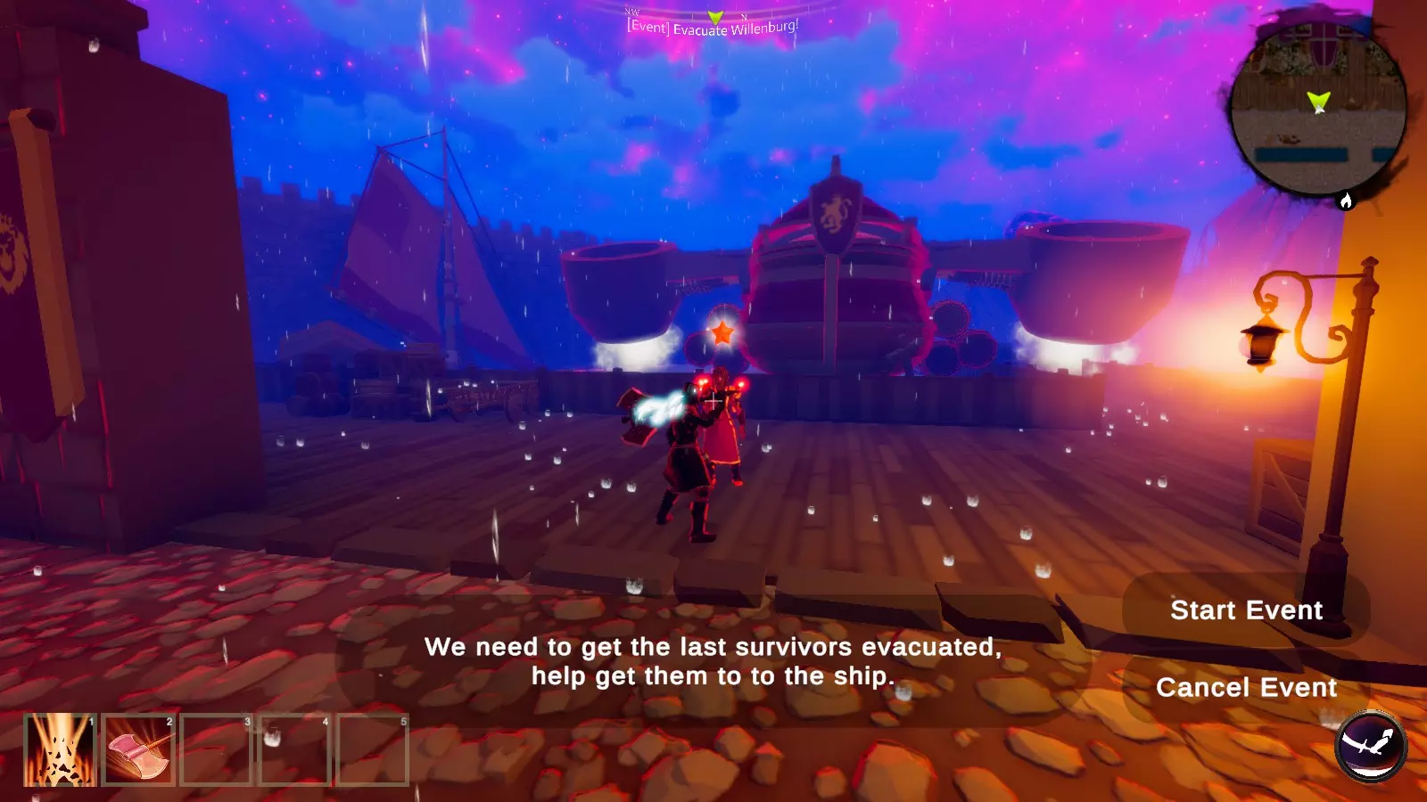 目标:鳞啸生物群体会波次生成并攻击补给箱,玩家必须抵御这些波次的攻击以保护补给箱,最终鳞啸之王会出现,击败它即可赢得活动。活动奖励数量取决于剩余补给箱的数量 失败条件:所有补给箱被摧毁 大海活动: 大海寻宝 起始地点:盗贼镇 推荐等级:50级以上(至少T2装备,具体取决于挖掘所在的岛屿,别忘了带上一两把铲子) 目标:活动开始后,宝藏会在整个大海中生成并在罗盘上标记。玩家需要前往这些地点挖掘宝藏。一旦找到获胜宝藏,活动即告结束,获胜宝藏箱外观更为华丽尊贵。活动获胜者将获得草帽(外观)和一颗光辉宝石,以及他们挖掘到的其他任何宝藏。 失败条件:50分钟时间限制,一旦找到获胜宝藏,活动将在几分钟内结束。 撤离威尔伦堡! 起始地点:盗贼镇 推荐等级:100级以上(队伍规模至少3-4人,等级相近)