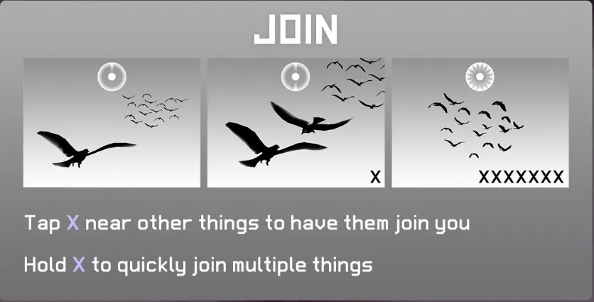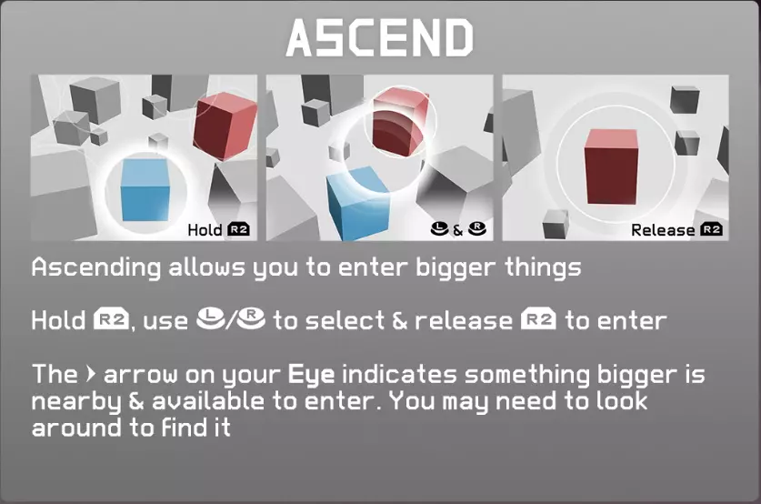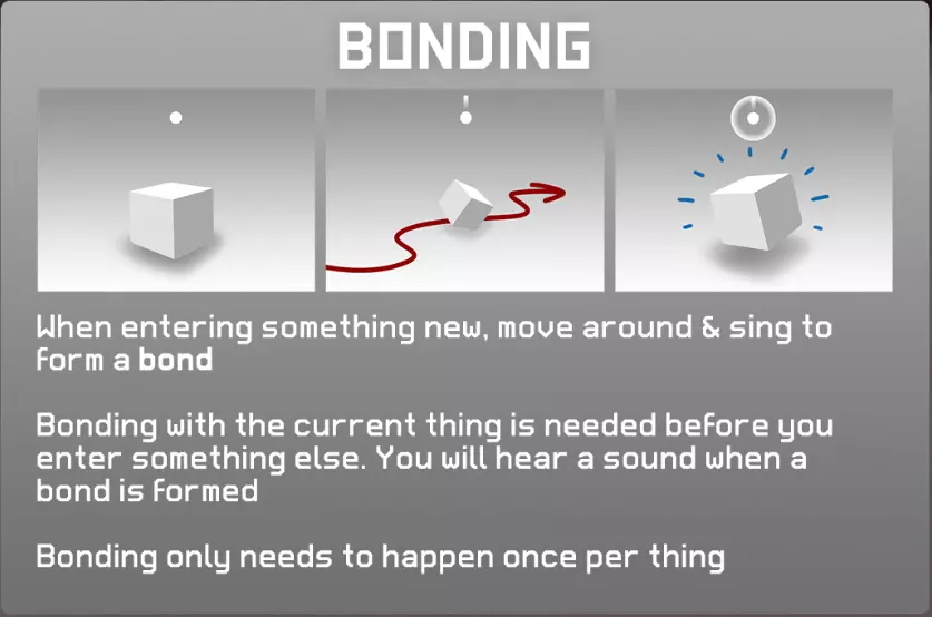 来到新世界后,去探索、歌唱并建立羁绊吧。 在附身其他事物之前,建立羁绊是必要的。 建立羁绊时会发出声音。 每个事物只需建立一次羁绊。 [注记] 虽然不太清楚建立羁绊的具体效果,但应该是为了增加可成为伙伴的事物种类。歌唱后会有善意反应的可成为伙伴的事物位置,会通过眼睛以线条显示出来。 06. Ascend