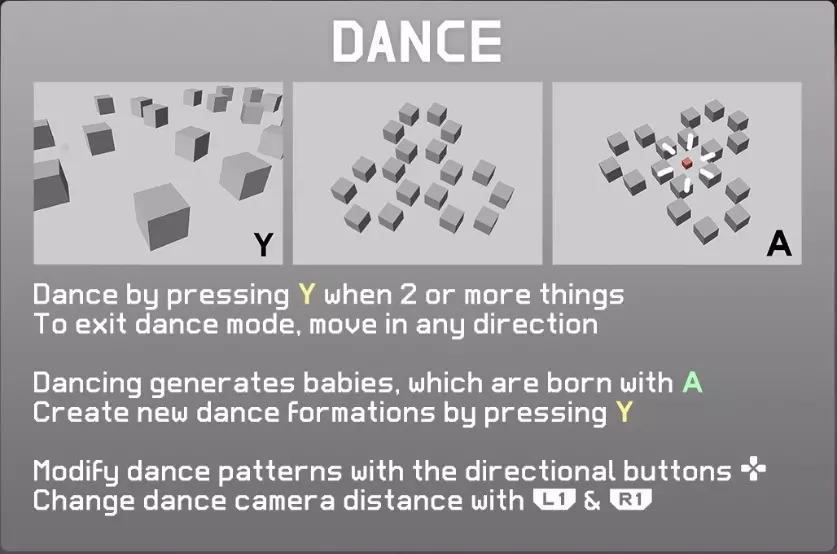 纪录片模式是一种更注重自动播放时画面表现的模式。 该模式下,相机视角会更加动态,优先拍摄移动中的场景。 并且,物体附身行为和世界变化行为等场景会自动剪辑。 与普通自动播放相比,此模式下的行动会受到限制。 会显示各个物体的说明,不过可以通过自动播放菜单切换显示状态。 按下R1键可切换至其他物体的说明。 16. Dance