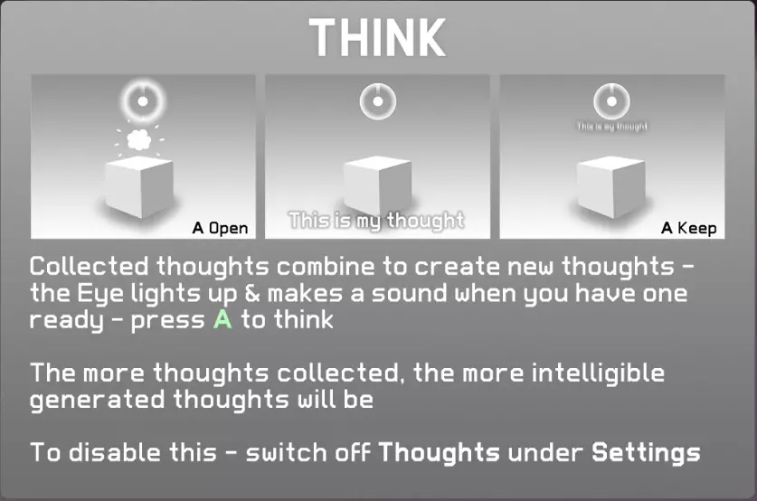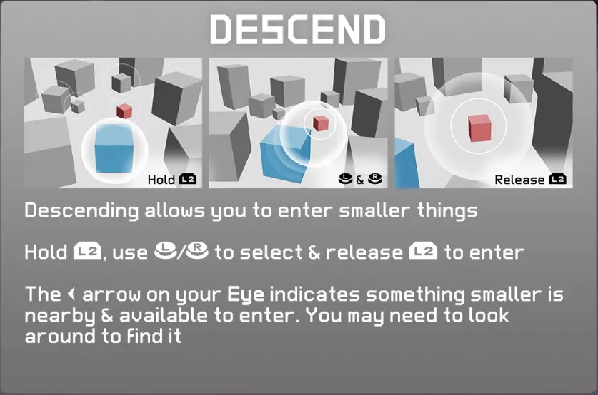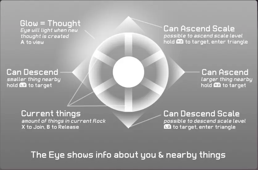 画面上部显示的眼睛会呈现周围的信息。 发光=思考 当眼睛发光时按下A键,会产生新的思考。 可下降(显示左箭头) 附近存在可通过L2键附身的小物体。 可降至不同尺寸(显示下箭头) 附近存在可通过L2键进入的大型世界入口。 可上升(显示右箭头) 附近存在可通过R2键附身的小物体。 可升至不同尺寸(显示上箭头) 附近存在可通过R2键进入的小型世界入口。 当前物体(显示线条) 附近存在可通过X键变为伙伴,通过B键解除伙伴关系的物体。03. 思考