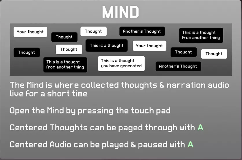 思维画面中包含至今收集到的思考和旁白。 按下返回按钮可打开思维画面。 将想要阅读的思考置于中心并按下A按钮,即可翻页。 将想要聆听的旁白置于中心并按下A按钮,即可播放语音。 14. Autoplay