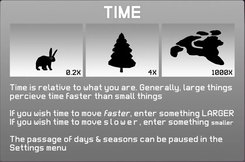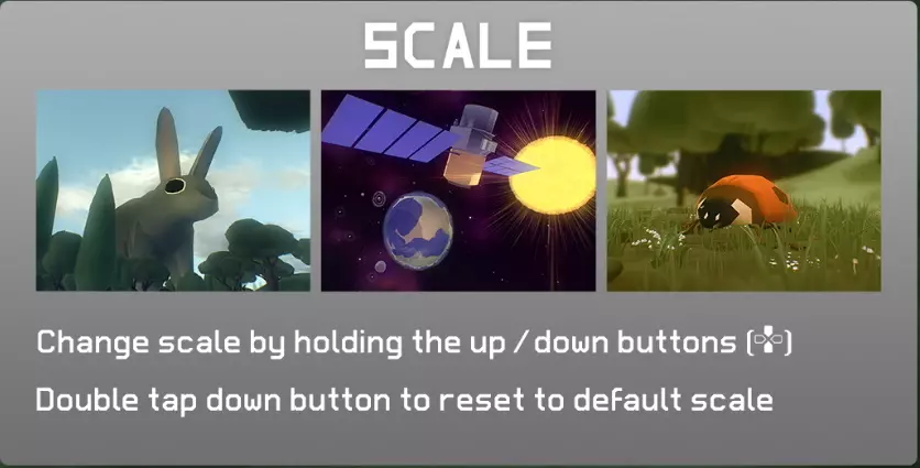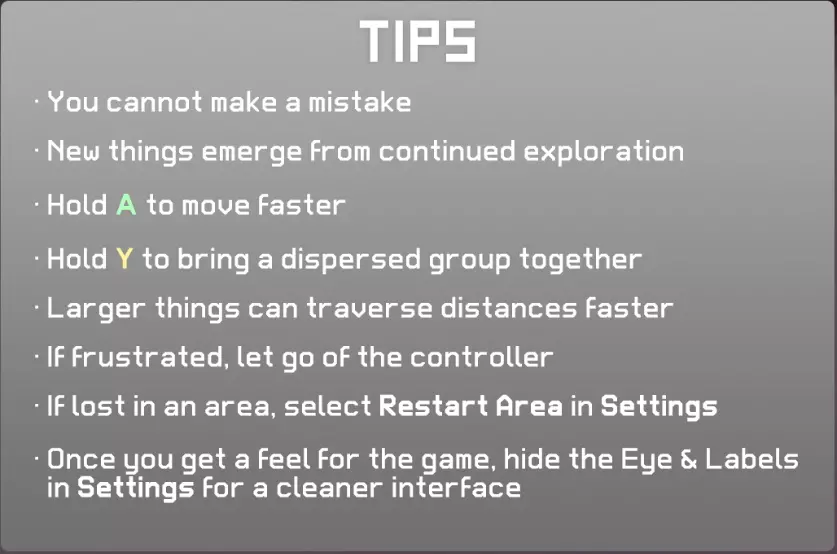 这款游戏没有游戏结束的设定 持续探索就能发现新事物 按住A键移动可以加快移动速度 按住Y键可以集合伙伴 体型越大的物体能更快地移动更长距离 如果操作感到烦躁,建议使用游戏手柄 如果迷路了,可以从设置中选择重新开始 熟悉游戏后,可以在设置中隐藏界面 作弊码 版本1.06新增功能,以【Fool】为名称开始游戏,即可在除思考外的全解锁状态下开始游戏 编辑历史 2018.03.21 公开