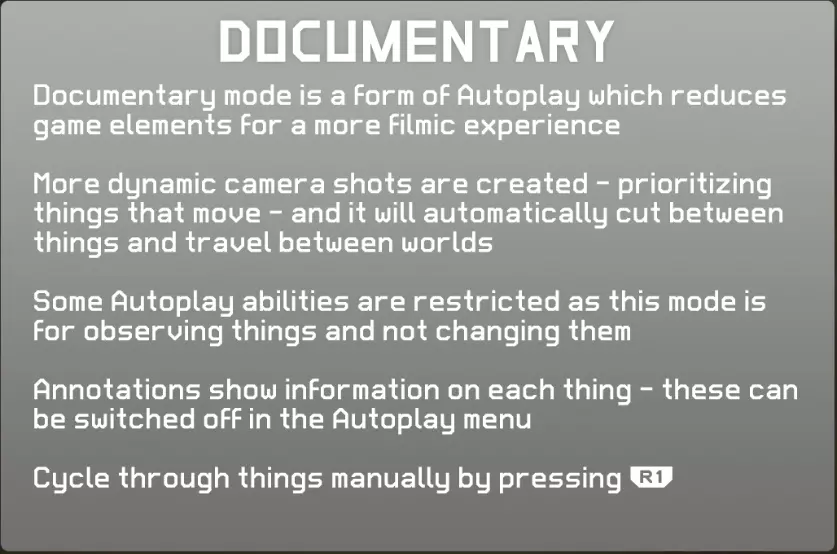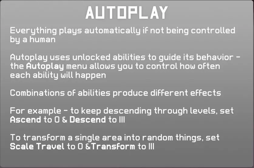 该游戏设有自动游玩功能,开启自动游玩后,若长时间未进行操作,系统会自动启动自动游玩。 在自动游玩模式下,已解锁的行动将自动执行。 可通过自动游玩菜单调整各项行动的频率。 调整各项行动的频率会使角色做出不同的行为(参数 频率低:0 → 频率高:3)。 例如,若想让角色持续变小,可将Ascend设为0,Descend设为3。 若希望在不改变世界的情况下,在当前区域内持续随机变身成各种事物,可将Travel设为0,Transform设为3。 15. 纪录片