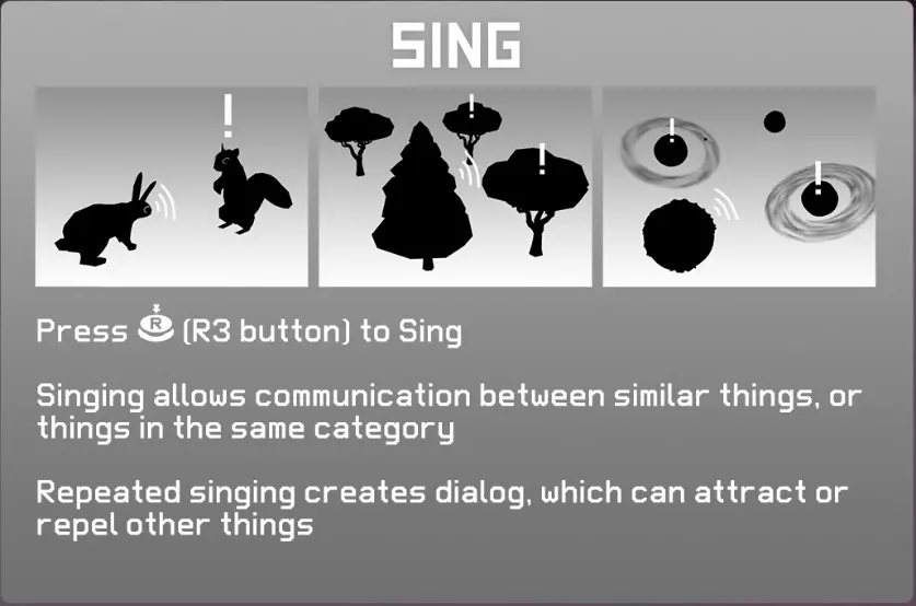 按下右摇杆可以唱歌。 唱歌能够与相同物品或相同类别的物品进行交流。 反复唱歌可以吸引或排斥其他物品。