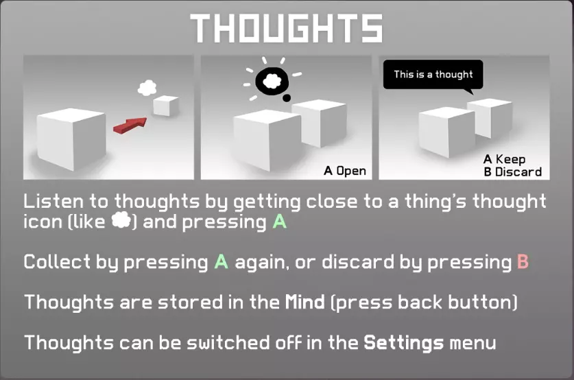 在带有【云朵图标】的物体附近按下【A键】,可以听到角色的思考。 收集思考需再次按下【A键】,若不需要则按下【B键】。 收集到的思考会排列在【思维画面】(按【返回键】打开)中。 可在【设置菜单】中关闭思考的显示。 04. 思考
