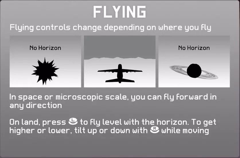 在宇宙和微观世界中,可以不受方向限制地自由飞行。 在地面上,使用左摇杆进行前后左右方向的移动,右摇杆调节上下方向。 13. 思维