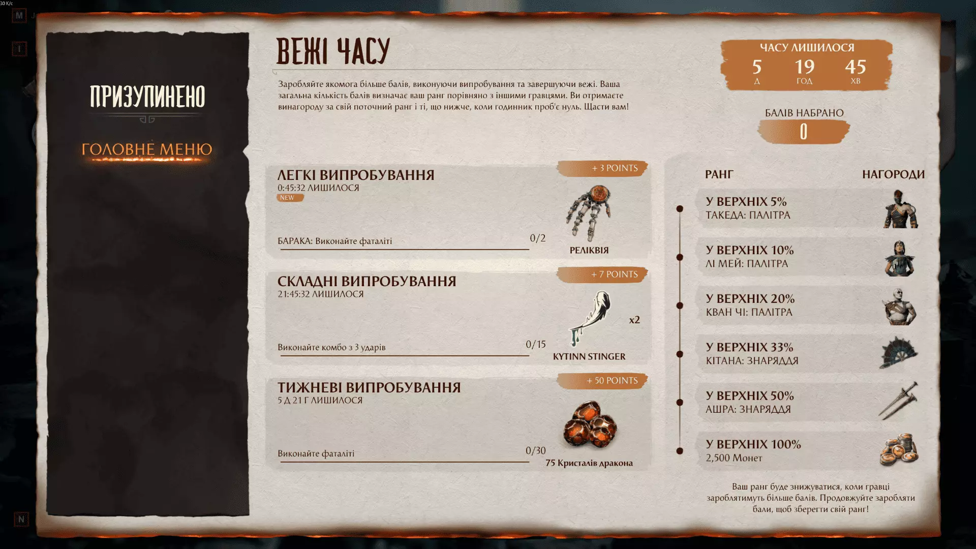 《真人快打1》乌克兰语文本本地化。翻译工作基于英语进行,并将替换游戏内的英文内容。 主要内容: 目前已完成翻译的部分: - 所有菜单 - 完整的主线剧情 - 完整的《混沌帝国》DLC剧情 - 99%的设置内容 - 部分入侵模式和时空塔内容 - 以及游戏中其他各处的大量文本 总体文本翻译进度为31%。翻译作者: Vapra ҐЛІТЧ(剧情) art-kandy 技术部分: art-kandy 翻译示例