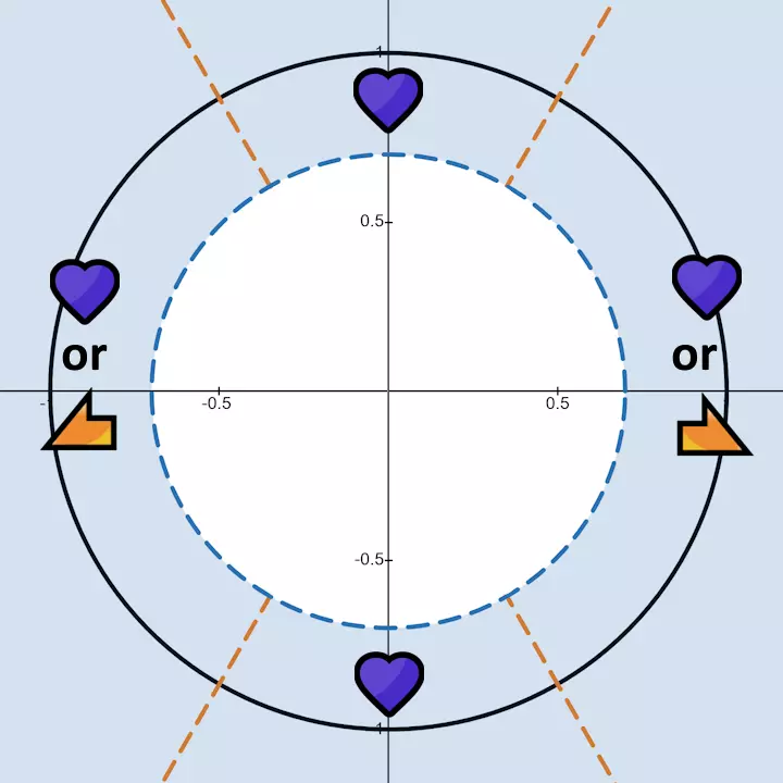 激活半径在图片中显示为蓝色阴影区域,白色部分为死区。优化此数值具有一定难度。一方面,你希望半径尽可能小,以减少从开始移动摇杆到输入触发之间的延迟;但另一方面,当需要交替方向或快速按压同一方向时,半径又需要足够大,以便能穿过它来停用和重新激活输入。在使用交替滑动操作时,很容易因刚好越过半径而意外错过较小的外部死区,这比听起来要常见。请避免将此数值设为1.0或0.0,建议将滑动死区外部值设为1。将该值设为0时,需要将摇杆完全推向某个方向才能激活输入,但许多控制器的校准方式无法保证在推动方向时始终达到1.0,这可能导致输入丢失。将其设为0.0会使输入除非摇杆完全居中否则不会停用,而大多数控制器实际上无法做到这一点,从而导致漏按音符。 直接摇杆角度死区 此设置仅在启用直接摇杆访问时生效。如果关闭直接摇杆访问,此设置将不起作用。