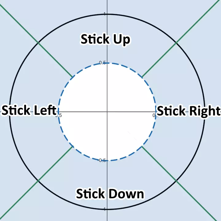 此示例图片展示了模拟死区为0.5时DJA关闭的状态。DJA关闭允许在控制选项卡中自定义摇杆输入。进入蓝色区域(由模拟死区设定边界)将触发任何绑定到摇杆方向的输入。越过绿色实线会触发额外输入,若不注意可能导致误输入或双重输入。我个人使用DJA关闭且模拟死区设为0.5,但未绑定摇杆上和摇杆下以防止误输入。不建议大多数用户采用此设置。DJA开启并配置合适的设置对大多数用户来说会更好。
