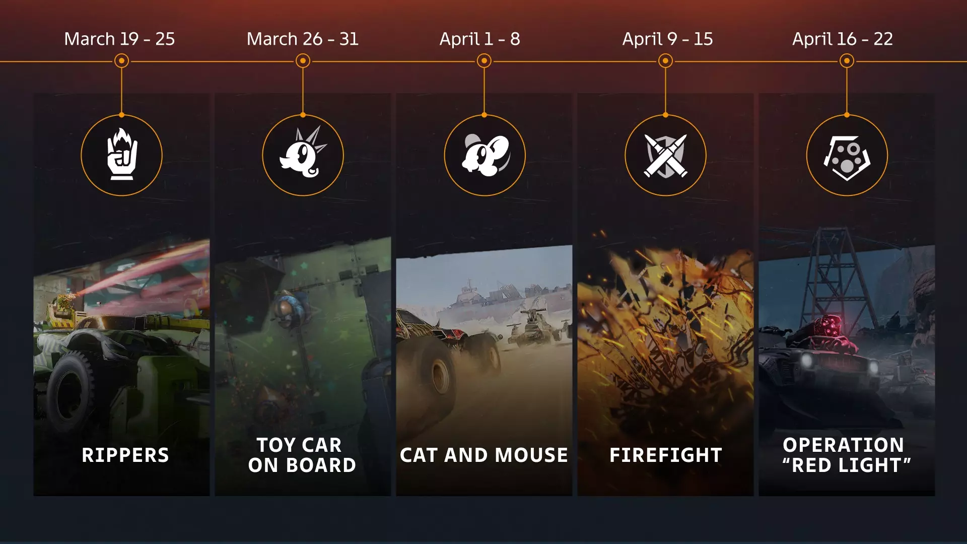 “闹剧”涂装; “挖掘者”装饰; 补给箱:“人道主义援助”和“军事储备”; 100个工程师徽章。 全新乱斗“猫鼠游戏” 注意!该模式将在4月1日至4月8日期间开放! “猫鼠游戏”是一场自由混战。主要目标是在规定时间内尽可能多地摧毁对手。 玩家将驾驶配备武器的相同小型载具开始战斗。 地图上的不同位置会定期出现蛋糕。成功“吃掉”蛋糕的玩家将暂时变身成巨型装甲车,几乎免疫伤害,并且可以用一枚火箭弹摧毁对手。 该模式战斗的奖励为塑料。特殊挑战奖励: