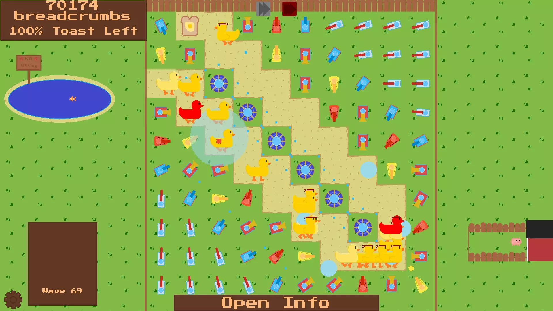 击杀100万只鸭子 70分钟内我击败了18000只鸭子,这意味着每分钟约260只,不算点击下一波按钮的时间,要达到100万只鸭子大约需要65小时。听起来有吸引力吗?我同意,开始吧。两种方法: 这种数量在无尽模式中更容易实现,在该模式中每一波的鸭子会越来越多,这意味着每分钟的鸭子数量将只取决于草坪的火力。策略如下:规划出这样的路径,从中心到角落建造防御塔,就像图片中那样,然后逐步升级它们——先建造一排,升级后再继续其他操作。
