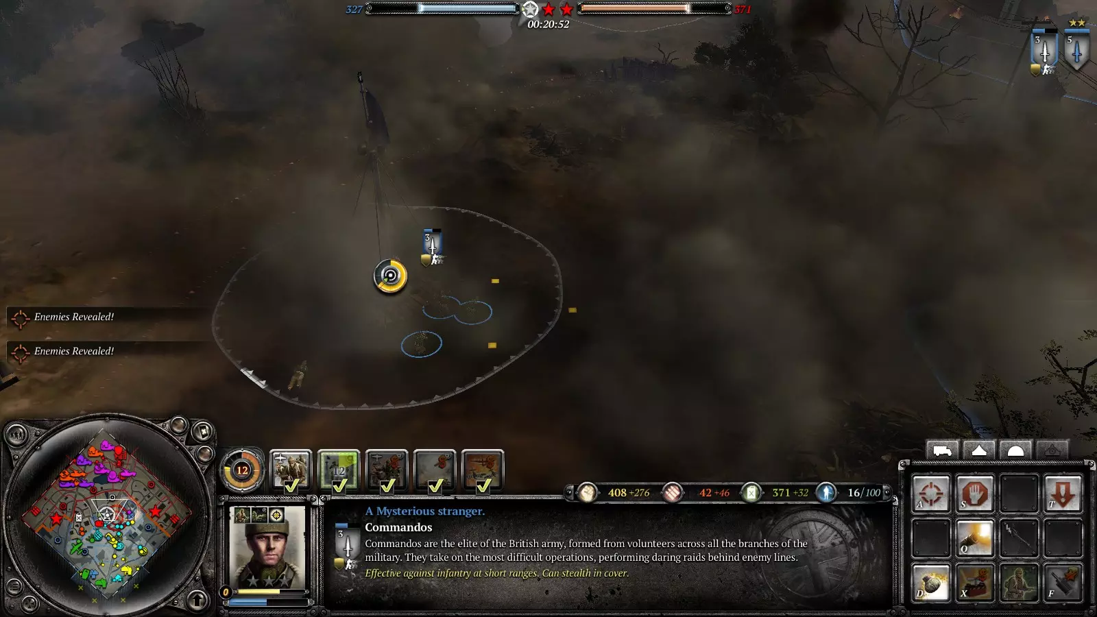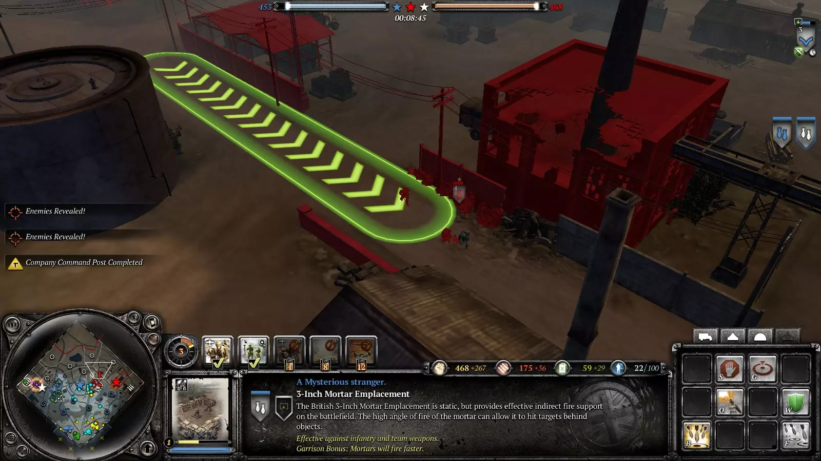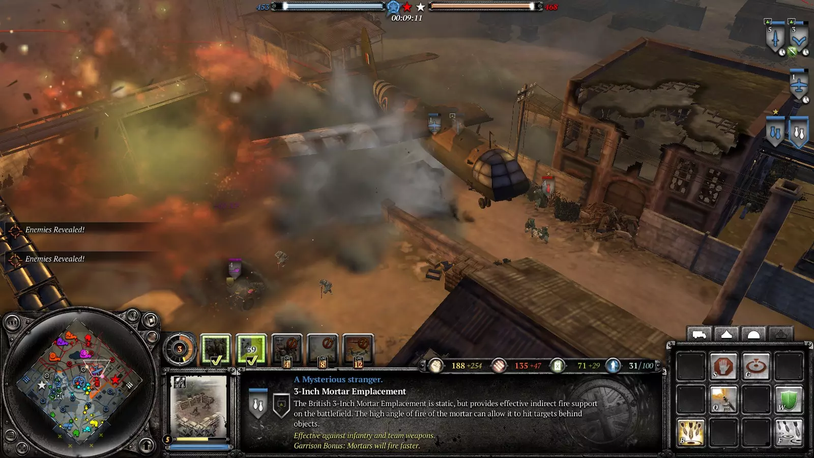 好的,士兵,迫击炮部署好了吗?部队都在吗?去他妈的,赶紧去抢占要点! 用烟雾弹掩护机枪、反坦克炮或者要点,或者直接呼叫烟雾空袭。派部队顶着烟雾冲向要点。敌人会被烟雾搞得晕头转向,开始往烟雾里扔手榴弹,你就在烟雾里埋伏好,把他们干掉。