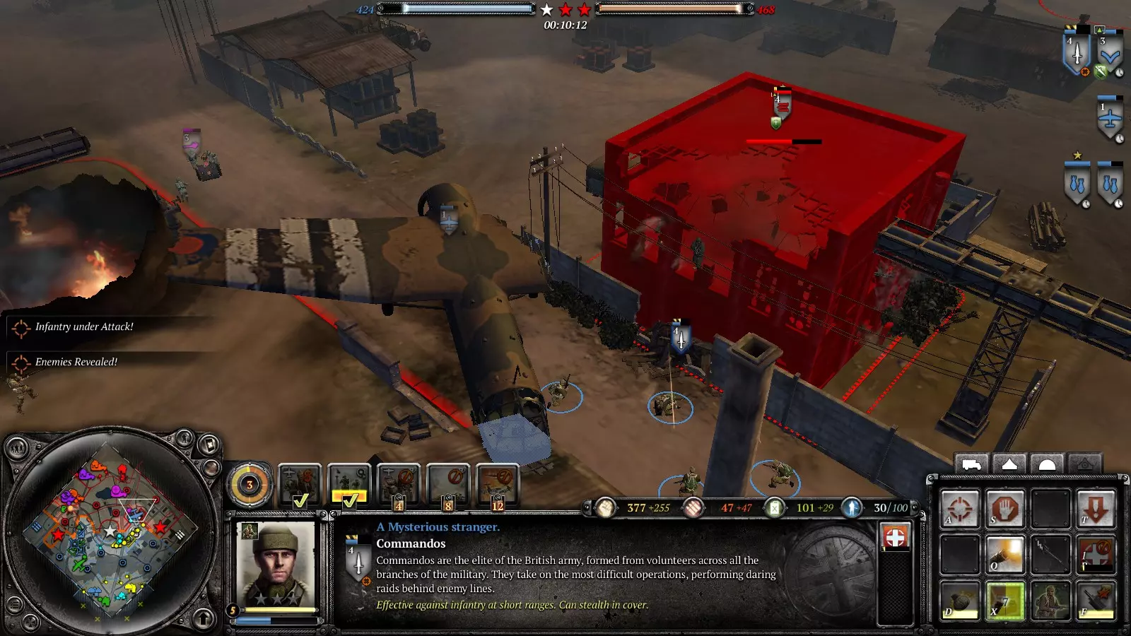 你把侦察机派往目标区域……目标区域。 针对你受到攻击的目标(机枪、火炮、防御工事,甚至是那个带高射炮的该死基地) 使用烟雾弹或空袭(一旦侦察机出现在小地图上,就对其将要着陆的地点发动空袭)准备好手榴弹或炸药(按下引爆键)。机枪、火炮无效。指挥部会损失50点生命值。如果再加上几辆坦克或火炮,德军的喷火车就只能说再见了……