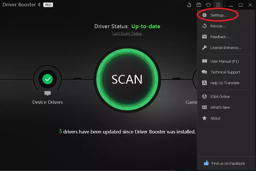 语言切换! 若要更改Driver Booster 4程序的语言,需执行以下操作: 打开程序,点击顶部的三条横线图标,然后点击设置按钮。