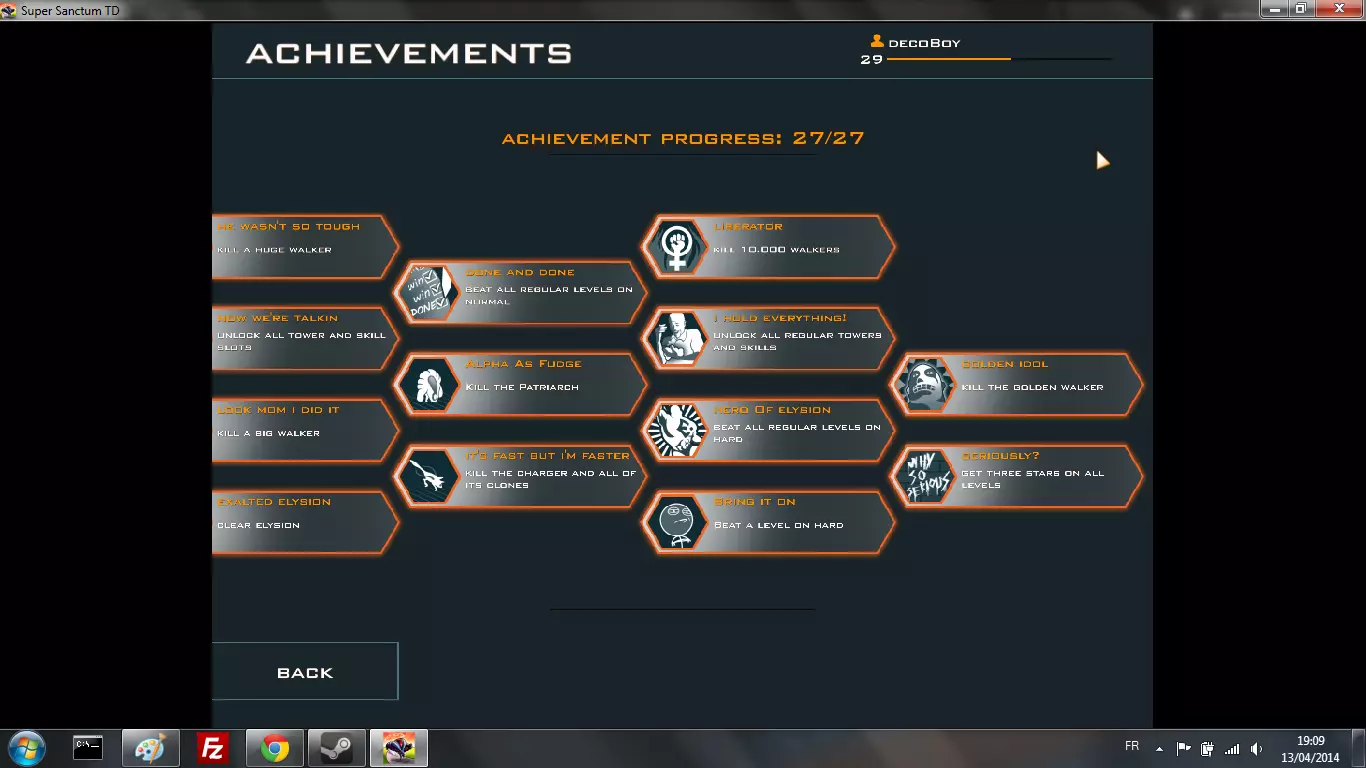 好了,您已经完成了困难模式的游戏。前往下一部分查看最后需要解锁的成就。 最后需要获取的成就 在困难模式下完成战役后,最后需要获取的成就如下: 按顺序开始: I hate maize:为此,选择一个简单关卡(谁说不能是第一关呢xD),在普通模式下不放置任何方块完成关卡。 Electrifying:用闪电弓(thunderbolt)击中10个敌人。这个非常简单。 Boom Baby:用一颗炸弹杀死2个敌人。如果您连瞄准2个步行者(walkers)都做不到,那我也帮不了您了。Core guardian:获得100波完美防守,即不让任何敌人逃脱(如果你在所有战役中都获得了3星,那么你几乎已经达成了这个成就)。如果没有的话,可以在生存模式中尽情尝试。 Put it down:要达成这个成就,你需要拥有重力提升技能,并用防空塔击杀一个敌人。这也没什么难的。 Monsterkill & Line em' up:我把这两个放在一起,因为它们几乎是同一回事。相关方法在这段视频中有说明(这是唯一一个我寻求了一点帮助的成就,因为我懒得再绞尽脑汁去想了) Liberator:需要击杀10000个敌人。为此,去玩生存模式吧。 Golden idol:击杀金色敌人。我不知道它是什么样子的,就我个人而言,我是在3级生存模式中杀死它的。根据我的研究,这种方法是最好的,而且它是随机出现的。 一个建议:坚持并重复3级生存模式,直到它出现(我个人总共大概打了不到100波)。 到这里你通常就已经获得这个了:
