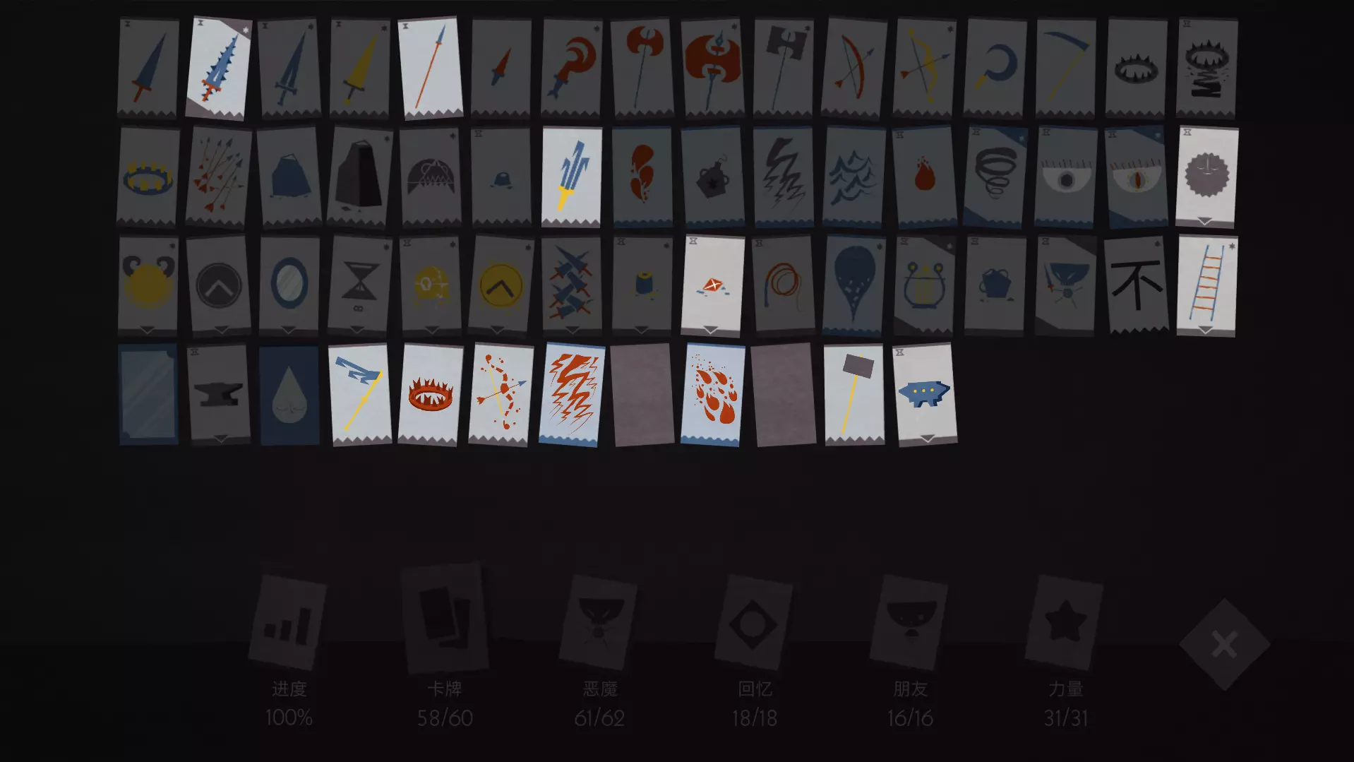 从2023-11-26我获得满成就开始(Wide Mouth成就在卡片数量50的时候解锁了),截至到指南发布初次之日(2023-11-30),即便是我在游戏内的进度已经显示为100%(卡牌58/60,恶魔61/62,回忆18/18,朋友16/16,力量31/31)依然还是有两张卡片没有找到。如果有朋友已经获得这两张卡片欢迎给我留言,将我从强迫症而不得圆满的痛苦中解救出来~在此谢过! 可以从宝箱获得的卡片 这一部分鼓励大家带上宝箱朋友和大嘴朋友,也许会获得出乎意料的惊喜呢~ 1.带刺的剑