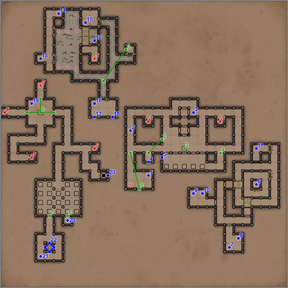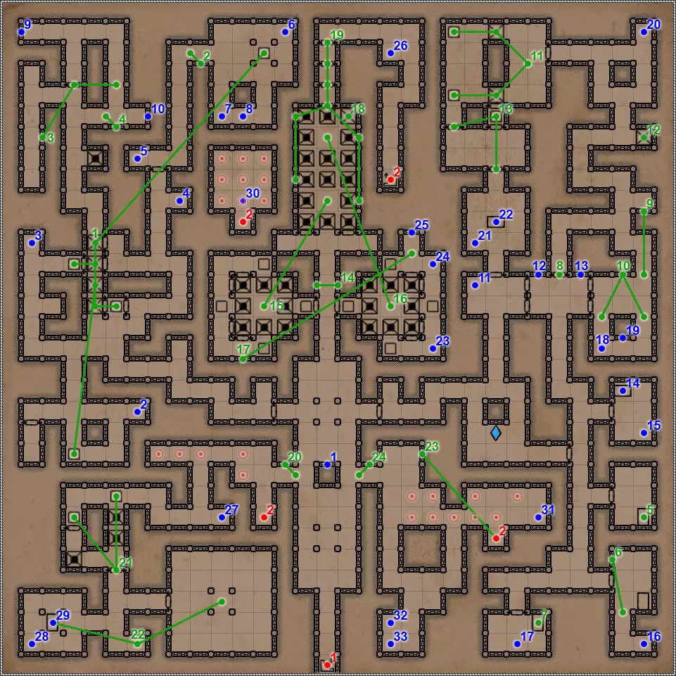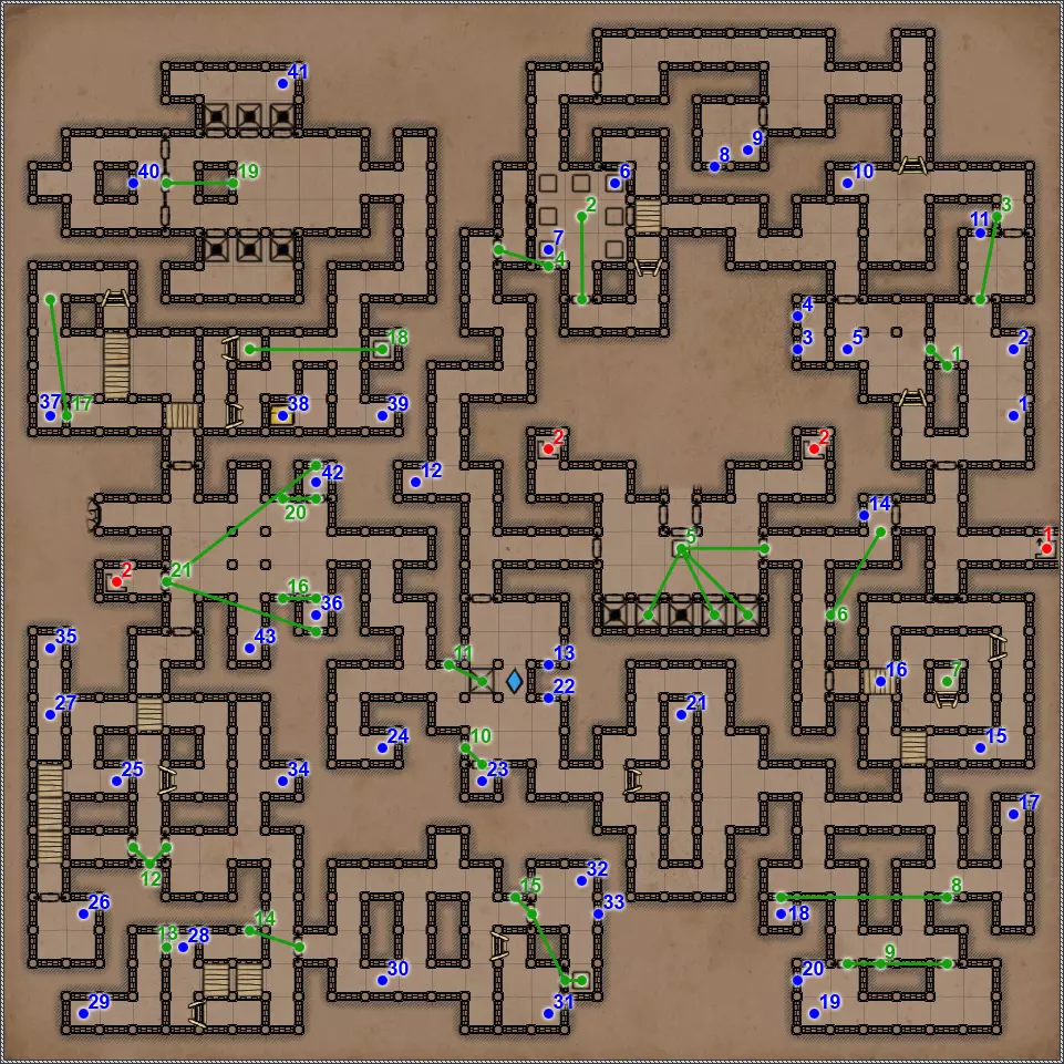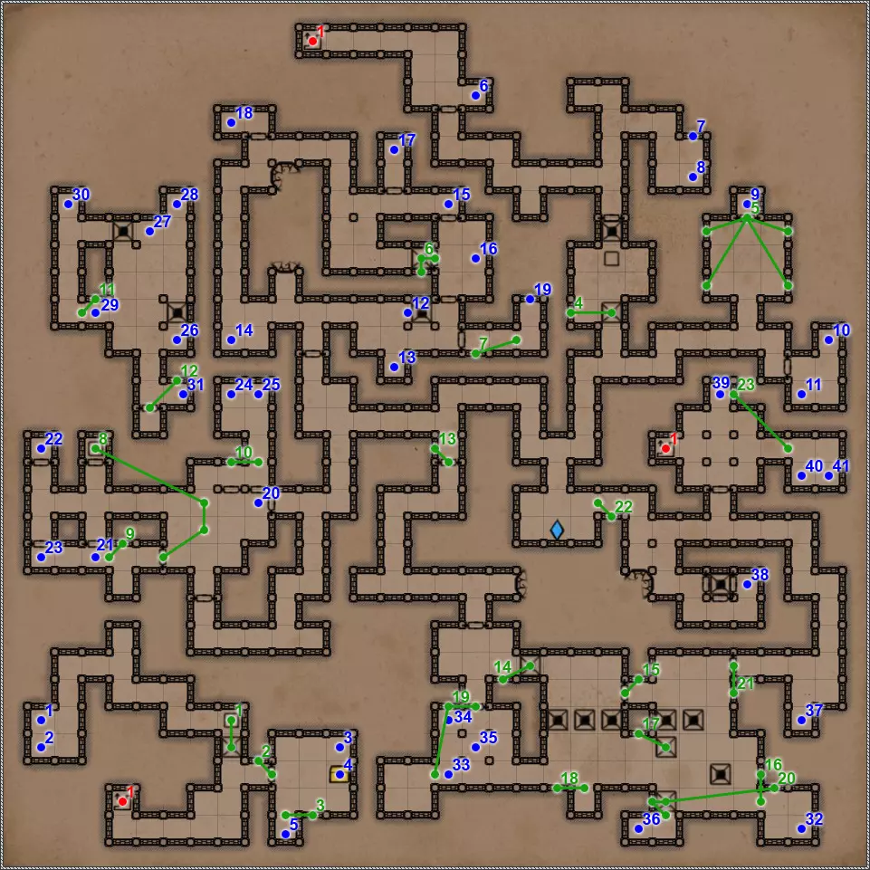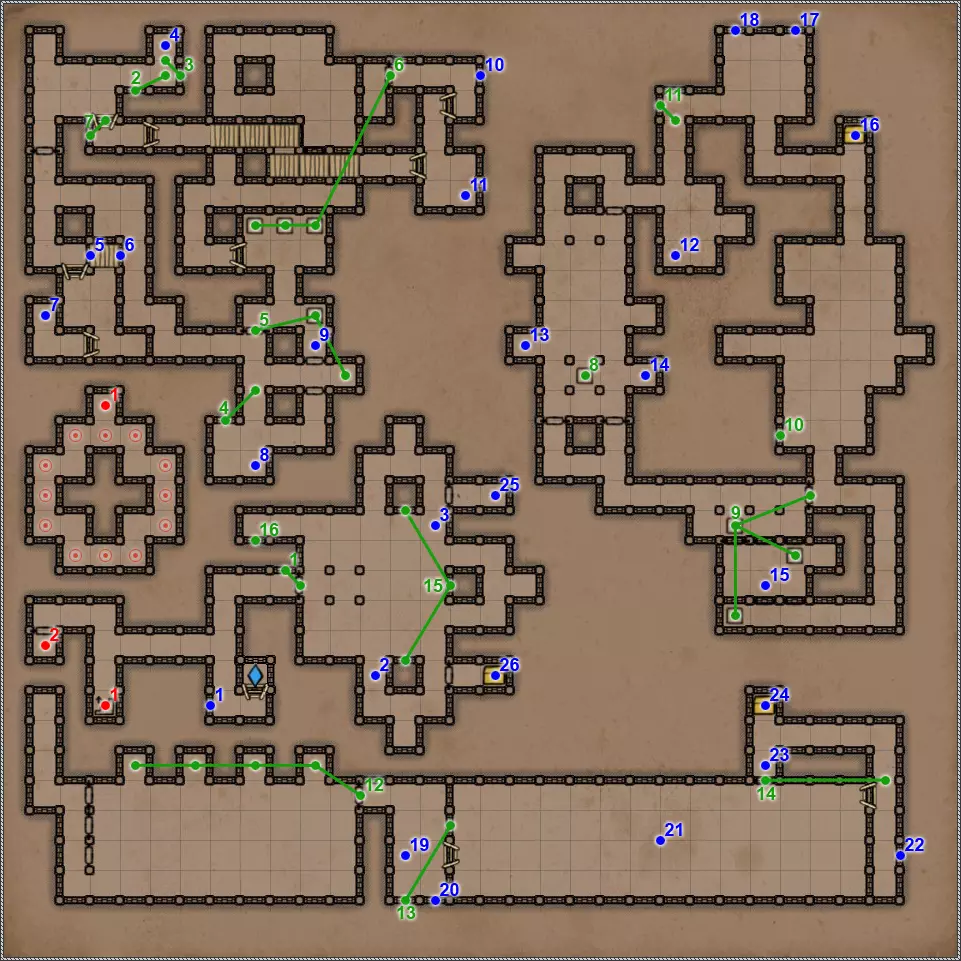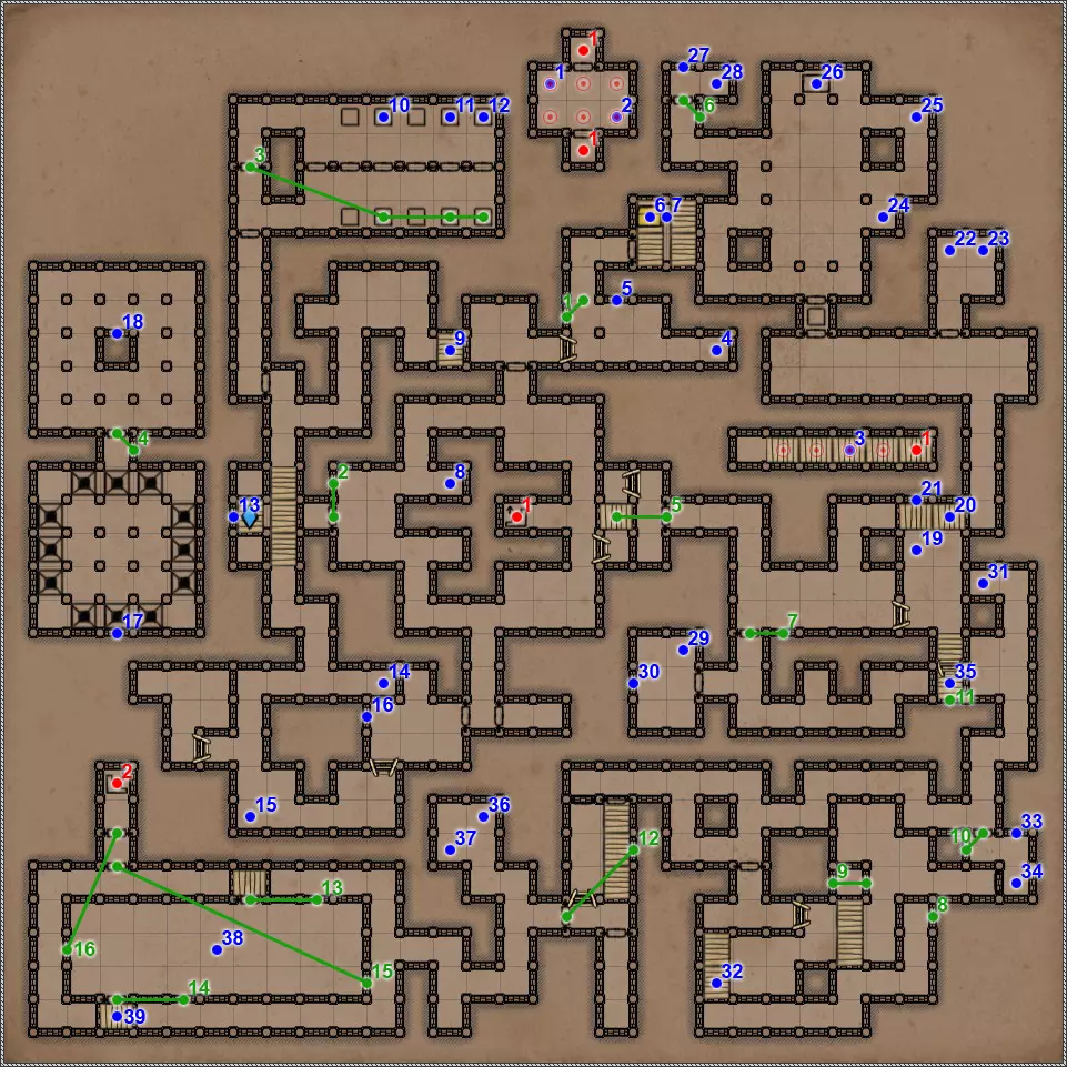 开关/谜题 按压板和地面孔洞。在金字塔的这个区域有4个按压板,每个按压板会关闭对应的孔洞。4个按压板中有2个还会打开藏有不同“好客”生物的壁龛和门。 隐藏按钮。会打开返回的通道。 按钮和格栅。按下按钮,然后迅速回到之前的走廊。秘密(63/77)。这个按钮还与一个秘密相关。打开格栅后,再次按下按钮并迅速跑到有钥匙的区域。格栅会在你身后关闭,并打开一条通往藏有部分镜面盔甲的小角落的秘密通道。 杠杆和隐藏通道。 需要将恐惧法杖(物品12)放在这个石棺上,才能打开8号门。 秘密(77个中的65个)。伪装按钮和隐藏通道。击败他后,力场将会消失,此时可以拾取宝剑,这会为你解锁一个秘密。 拉杆:激活返回【仪式之墓】的传送门。 伪装按钮和隐藏通道。需要将月刃(物品13)放置在这个石棺上,以打开8号门。 关闭的门。要打开它,必须将两侧壁龛中的法杖和剑分别放在5号和7号石棺上。谜题的关键在于每个墓室中埋葬的人数。只有通过左侧房间的门进入这部分地下城后,才能取到这两件物品。 伪装的按钮和隐藏的通道。秘密(66/77)。按钮与隐藏通道。 两块压力板和地面上的孔洞。先进入孔洞,然后用投掷物或箭矢固定住两块压力板。 地面上的孔洞。初始状态下是关闭的。要打开它并下去,需要固定住第11点中的两块压力板。 压力板和两个格栅。要继续前进,首先需要在北侧的压力板上放置物品——这将打开通往新房间的格栅。然后需要在南侧的压力板上放置物品,返回北侧拿走物品,最后回到新房间拿走南侧的物品。 两个钥匙孔用于放置【墓穴钥匙】(物品编号9、22)。第一个谜题部分,需要解决它才能进入金字塔的下一层。其运作机制简单到不能再简单,所以我直接说,需要固定北面、南面和东面的石板,这样就能顺利按下第19号谜题的所有按钮。 第二个谜题部分。令人惊讶的是,这里同样需要固定北面、南面和东面的石板。 秘密(77个中的68个)。隐藏的按钮和秘密通道。秘密(77个中的第69个)。如果你已触发第15和16点中提到的石板,那么这一排地面上会出现唯一的一个开口。跳入此处即可进入地下墓穴的秘密区域。 四个格栅和四个按钮。 伪装按钮和隐藏通道。 这是一个包含两个踩压式地面石板、传送门和陷阱坑的解谜。你首先需要做的是在第一个压力板正下方的地面上那个封闭的洞口放置物品,这样才能进入地下墓穴的秘密区域。现在,在格栅旁边的压力板上放置物品,但要确保能从另一边取回该物品。此时,第一个洞口上方会出现传送门,洞口本身也会开启。我们放置的物品顺利掉落下去,压住了那里的压力板,现在在地下墓穴可以找到下一个秘密,但这与解开这个谜题无关。跳进传送门,你会出现在栅栏的另一边。从压力板上拿起物品——这样会关闭洞口。现在走到关闭的门前,只需朝第一个压力板的方向扔个什么东西。通道就打开了。 秘密(72/77)。这算不上什么秘密,更像是对队伍战斗能力的挑战。进入传送门后,你会来到一个5x5的房间,里面只有两只戈耳工和三条眼镜蛇。房间的角落里有带陷阱的地板区域,所以你无法躲到那里去。总的来说,对我个人而言,这是一场非常棘手且艰难的战斗。而战斗的奖励则是隔壁房间里的一把史诗级双手剑。
