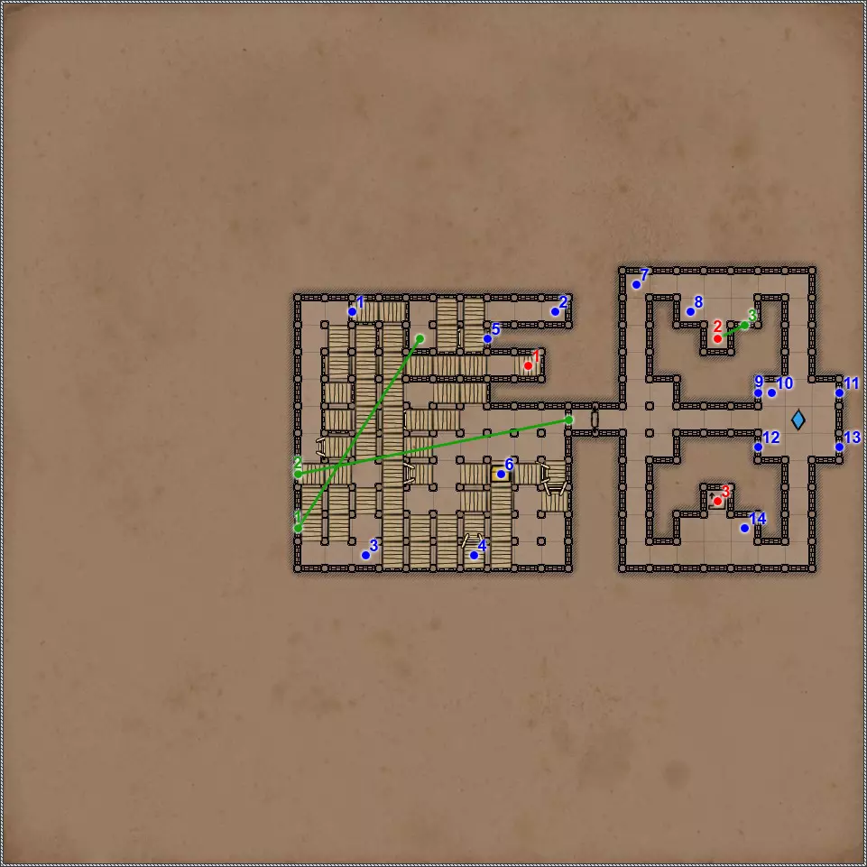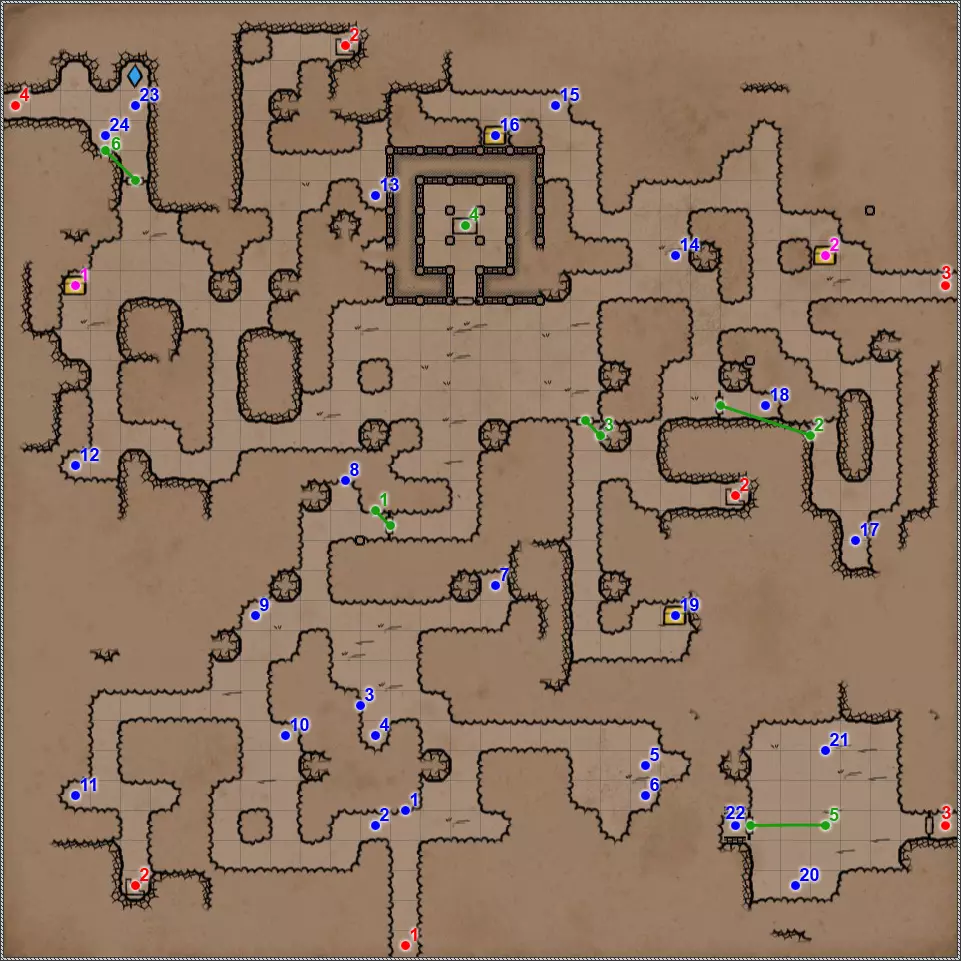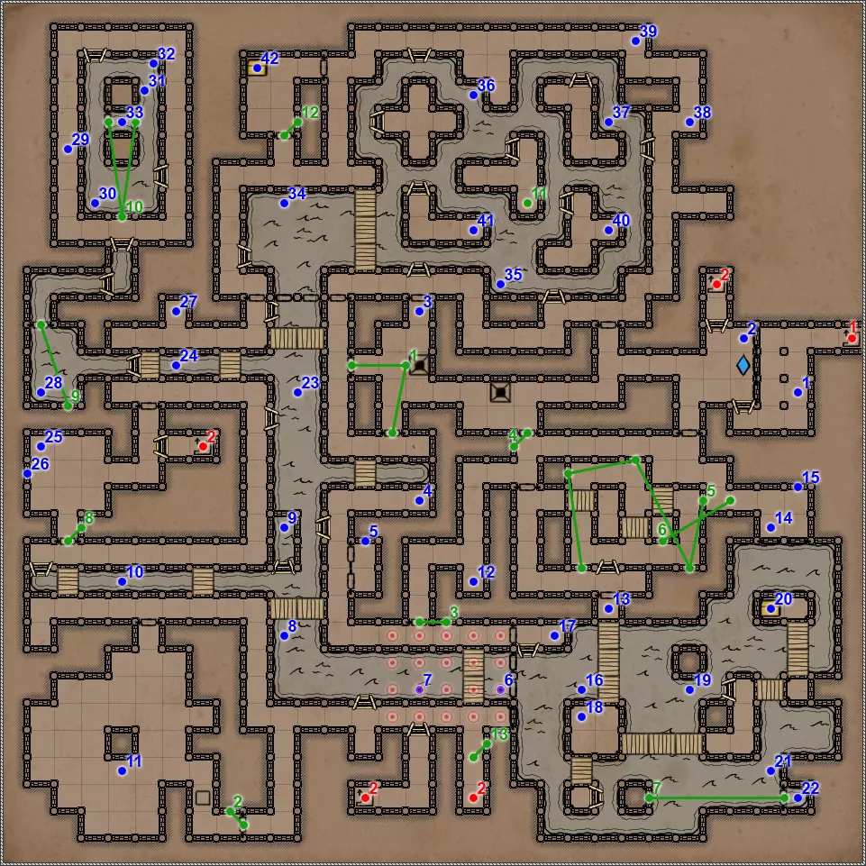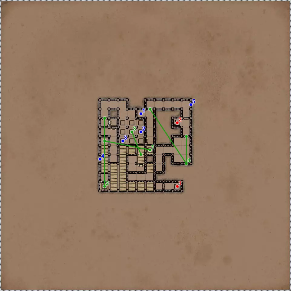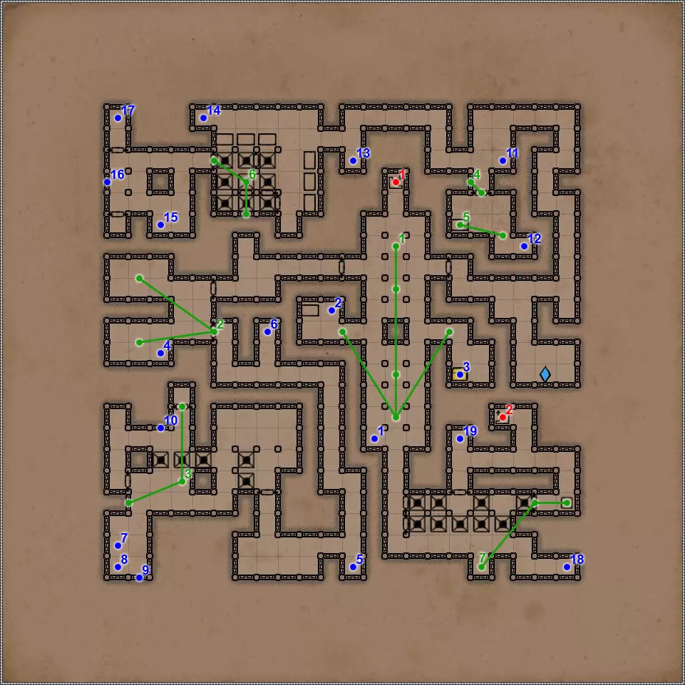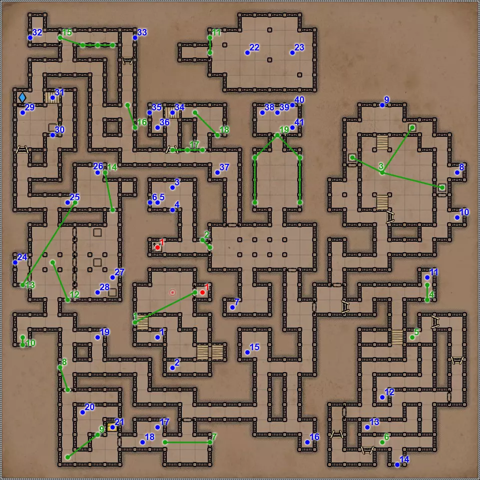 开关/谜题 按压板和地面孔洞。在金字塔的这个区域有4个按压板,每个按压板会关闭对应的孔洞。4个按压板中有2个还会打开藏有不同“好客”生物的壁龛和门。 隐藏按钮。会打开返回的通道。 按钮和格栅。按下按钮,然后迅速回到之前的走廊。秘密(63/77)。这个按钮还与一个秘密相关。打开格栅后,再次按下按钮并迅速跑到有钥匙的区域。格栅会在你身后关闭,并打开一条通往藏有部分镜面盔甲的小角落的秘密通道。 杠杆和隐藏通道。 需要将恐惧法杖(物品12)放在这个石棺上,才能打开8号门。 秘密(77个中的65个)。伪装按钮和隐藏通道。击败他后,力场将会消失,此时可以拾取宝剑,这会为你解锁一个秘密。 拉杆:激活返回【仪式之墓】的传送门。 伪装按钮和隐藏通道。需要将月刃(物品13)放置在这个石棺上,以打开8号门。 关闭的门。要打开它,必须将两侧壁龛中的法杖和剑分别放在5号和7号石棺上。谜题的关键在于每个墓室中埋葬的人数。只有通过左侧房间的门进入这部分地下城后,才能取到这两件物品。 伪装的按钮和隐藏的通道。秘密(66/77)。按钮与隐藏通道。 两块压力板和地面上的孔洞。先进入孔洞,然后用投掷物或箭矢固定住两块压力板。 地面上的孔洞。初始状态下是关闭的。要打开它并下去,需要固定住第11点中的两块压力板。 压力板和两个格栅。要继续前进,首先需要在北侧的压力板上放置物品——这将打开通往新房间的格栅。然后需要在南侧的压力板上放置物品,返回北侧拿走物品,最后回到新房间拿走南侧的物品。 两个钥匙孔用于放置【墓穴钥匙】(物品编号9、22)。第一个谜题部分,需要解决它才能进入金字塔的下一层。其运作机制简单到不能再简单,所以我直接说,需要固定北面、南面和东面的石板,这样就能顺利按下第19号谜题的所有按钮。 第二个谜题部分。令人惊讶的是,这里同样需要固定北面、南面和东面的石板。 秘密(77个中的68个)。隐藏的按钮和秘密通道。秘密(77个中的第69个)。如果你已触发第15和16点中提到的石板,那么这一排地面上会出现唯一的一个开口。跳入此处即可进入地下墓穴的秘密区域。 四个格栅和四个按钮。 伪装按钮和隐藏通道。 这是一个包含两个踩压式地面石板、传送门和陷阱坑的解谜。你首先需要做的是在第一个压力板正下方的地面上那个封闭的洞口放置物品,这样才能进入地下墓穴的秘密区域。现在,在格栅旁边的压力板上放置物品,但要确保能从另一边取回该物品。此时,第一个洞口上方会出现传送门,洞口本身也会开启。我们放置的物品顺利掉落下去,压住了那里的压力板,现在在地下墓穴可以找到下一个秘密,但这与解开这个谜题无关。跳进传送门,你会出现在栅栏的另一边。从压力板上拿起物品——这样会关闭洞口。现在走到关闭的门前,只需朝第一个压力板的方向扔个什么东西。通道就打开了。 秘密(72/77)。这算不上什么秘密,更像是对队伍战斗能力的挑战。进入传送门后,你会来到一个5x5的房间,里面只有两只戈耳工和三条眼镜蛇。房间的角落里有带陷阱的地板区域,所以你无法躲到那里去。总的来说,对我个人而言,这是一场非常棘手且艰难的战斗。而战斗的奖励则是隔壁房间里的一把史诗级双手剑。
