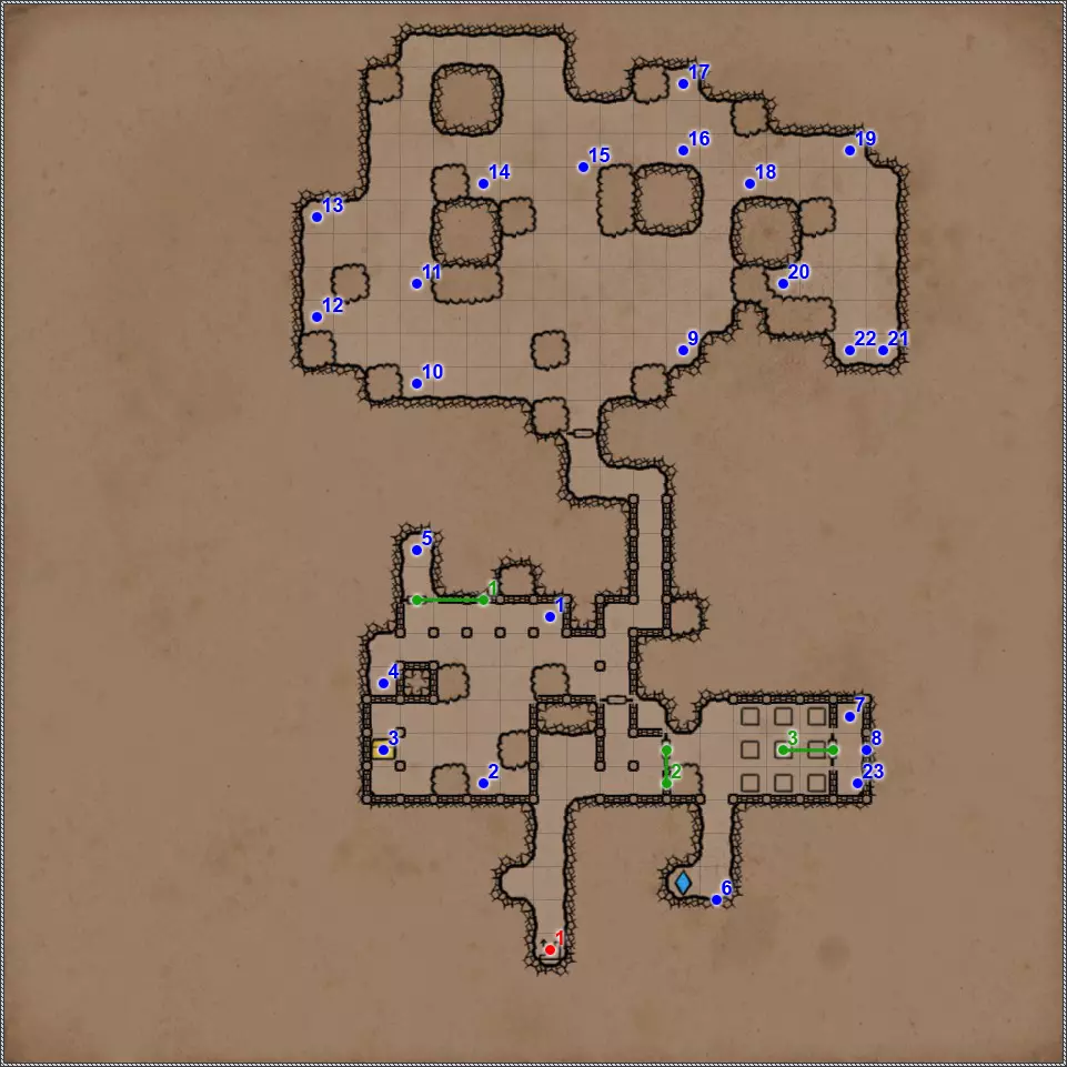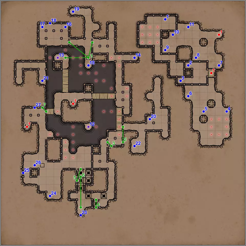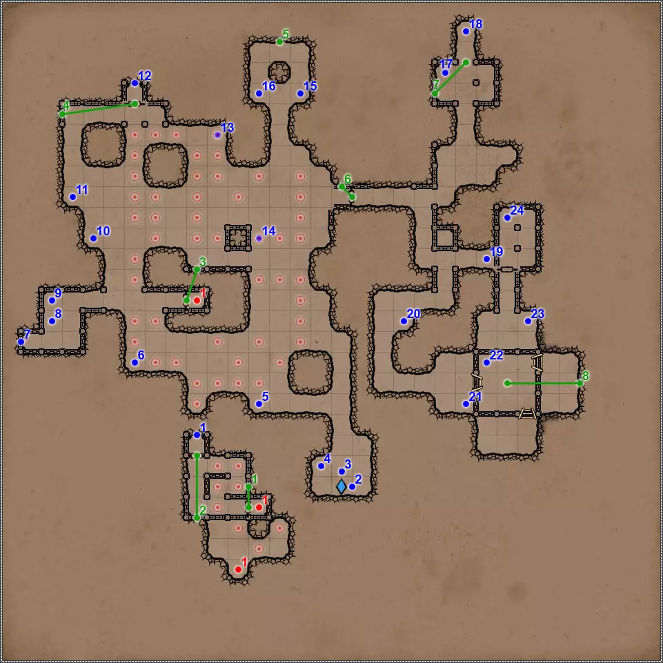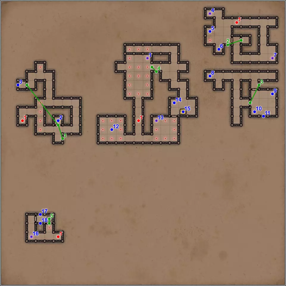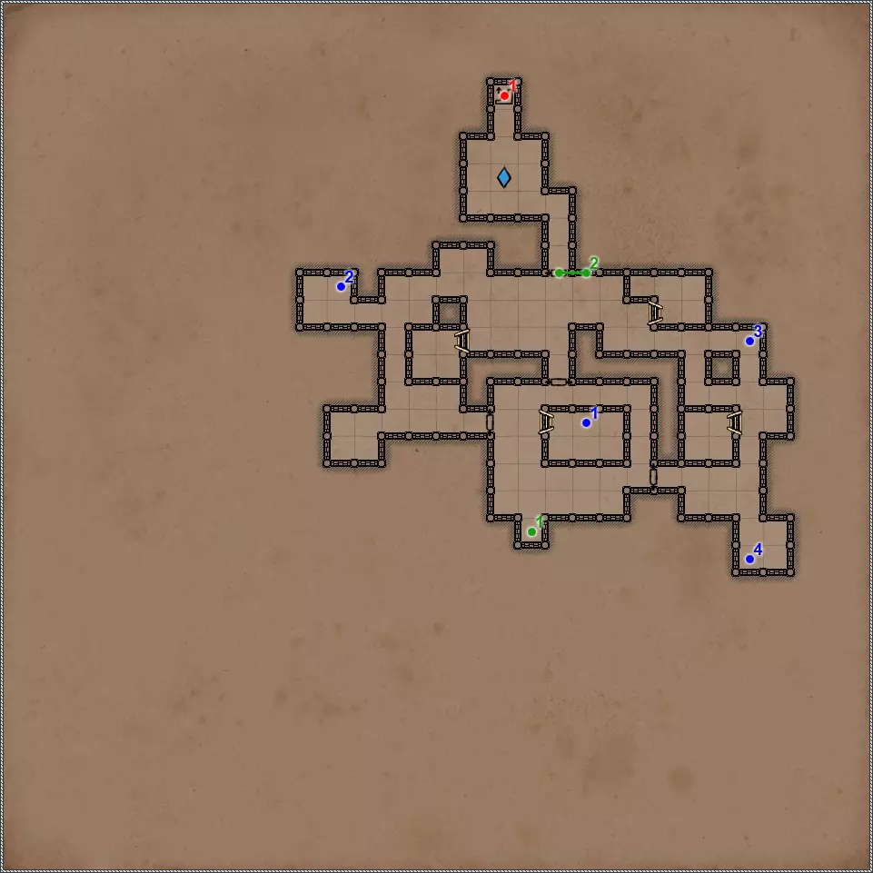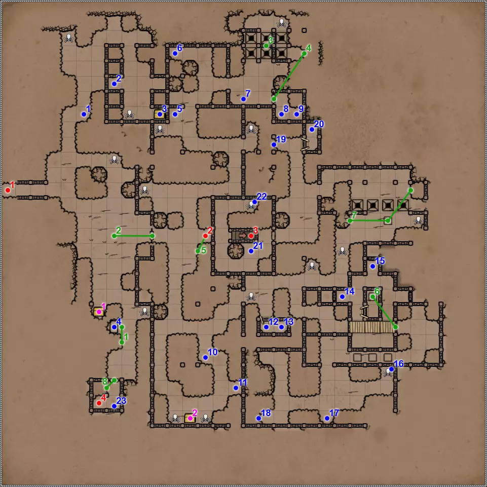 开关/谜题 拉杆与关闭的门。 隐藏按钮。用于开启/关闭传送门。 秘密(47/77)。隐藏按钮与秘密通道。 拉杆与秘密通道。 关闭的门、压力板和传送门。要打开门,需向传送门投掷一些轻物。 关闭的门与能量场谜题。要打开门,需要踩过所有地砖,确保房间内不再有能量场元素(当你踩过它们后,它们会在你身后消失),并最终站在门旁边的平台上。 拉杆和隐藏通道。 压力板上有你在【Twigroot Tunnels】(Twigroot Tunnels)认识的“朋友”小妖精。一旦它离开压力板,藏有骷髅和其他怪物的壁龛就会打开,包括传送门附近的壁龛。和上次一样,无法杀死这个嚣张的怪物。 三块压力板谜题。首先,当力场消失时,需要往下方的压力板上扔东西。这会打开上方压力板对面的栅栏。上方的压力板会暂时移除坑对面压力板上的力场。这时需要准确把握时机,把东西扔到另一边。 漂浮光球谜题。点击按钮,所有球体将会出现。现在你的任务是穿过房间,且不能碰到任何一个球体。如果你碰到球体,前方走廊的某个区域就会出现力场。 杠杆与隐藏通道。 联想谜题。你需要拉动与其他三个凹槽中的物品或怪物不同的那个凹槽对面的杠杆。重复操作直至门打开。在有能量场的房间里还坐着一群不同的怪物。如果你拉动错误的拉杆,就会释放出一些怪物,并且你会受到火焰伤害。原则上,为了经验值,建议你消灭所有怪物。 这与其说是谜题,不如说是一种简化房间通过难度的方法。需要移开下方和上方的火炬,这样就能看到地面上被照亮的区域。尖刺不会出现在这些区域上。 秘密(48/77)。隐藏按钮与秘密通道。 三个锁孔对应【头骨钥匙】(物品编号10、18、22)。当使用全部三把钥匙后,【奥鲁尔·蠕虫束缚者】会出现,同时房间两侧的两扇格栅门会打开。尽快消灭它,否则它会召唤大量僵尸,你将被僵尸淹没。 按钮:重新激活传送门并打开房间出口。