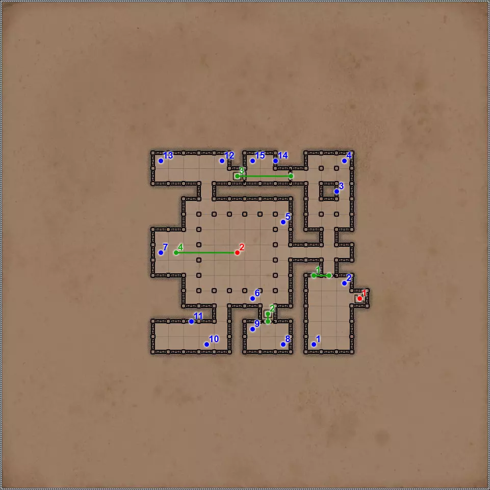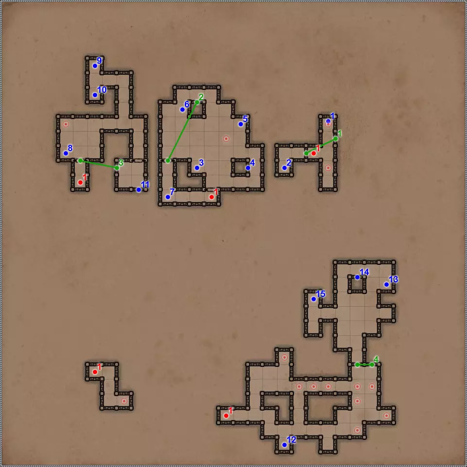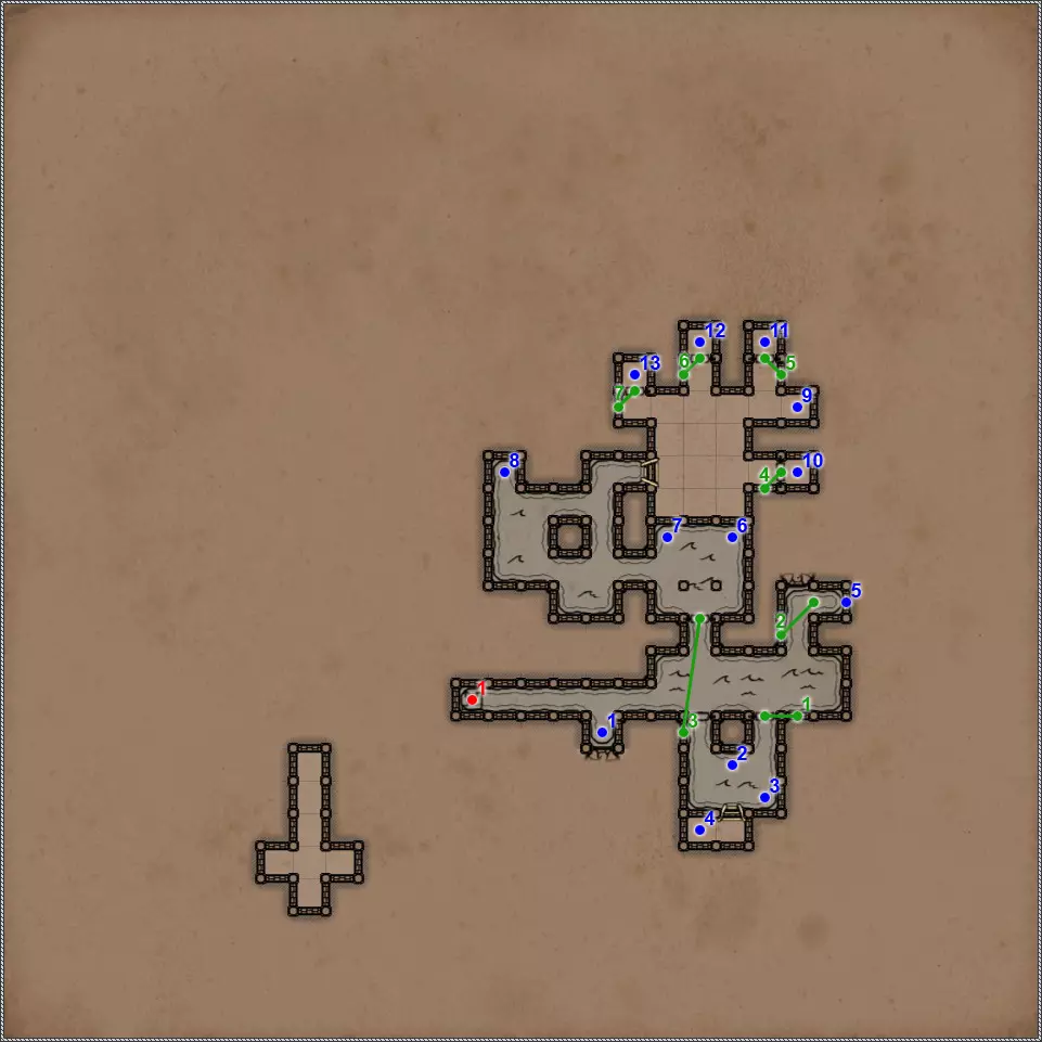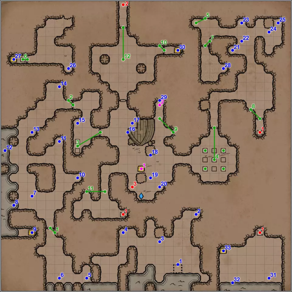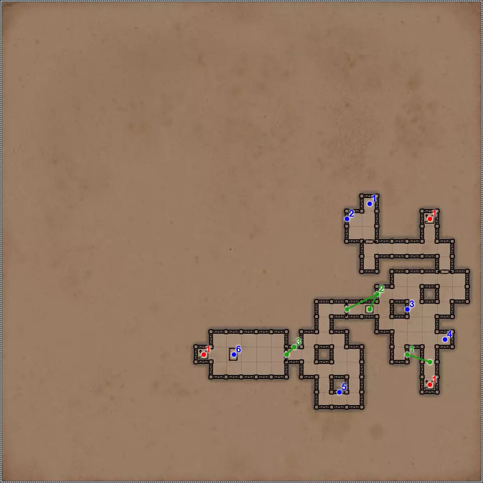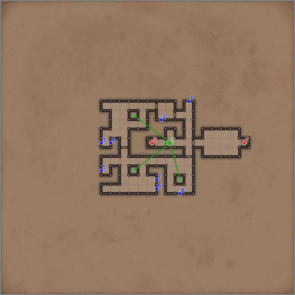 开关/谜题 拉杆与关闭的门。 隐藏按钮。用于开启/关闭传送门。 秘密(47/77)。隐藏按钮与秘密通道。 拉杆与秘密通道。 关闭的门、压力板和传送门。要打开门,需向传送门投掷一些轻物。 关闭的门与能量场谜题。要打开门,需要踩过所有地砖,确保房间内不再有能量场元素(当你踩过它们后,它们会在你身后消失),并最终站在门旁边的平台上。 拉杆和隐藏通道。 压力板上有你在【Twigroot Tunnels】(Twigroot Tunnels)认识的“朋友”小妖精。一旦它离开压力板,藏有骷髅和其他怪物的壁龛就会打开,包括传送门附近的壁龛。和上次一样,无法杀死这个嚣张的怪物。 三块压力板谜题。首先,当力场消失时,需要往下方的压力板上扔东西。这会打开上方压力板对面的栅栏。上方的压力板会暂时移除坑对面压力板上的力场。这时需要准确把握时机,把东西扔到另一边。 漂浮光球谜题。点击按钮,所有球体将会出现。现在你的任务是穿过房间,且不能碰到任何一个球体。如果你碰到球体,前方走廊的某个区域就会出现力场。 杠杆与隐藏通道。 联想谜题。你需要拉动与其他三个凹槽中的物品或怪物不同的那个凹槽对面的杠杆。重复操作直至门打开。在有能量场的房间里还坐着一群不同的怪物。如果你拉动错误的拉杆,就会释放出一些怪物,并且你会受到火焰伤害。原则上,为了经验值,建议你消灭所有怪物。 这与其说是谜题,不如说是一种简化房间通过难度的方法。需要移开下方和上方的火炬,这样就能看到地面上被照亮的区域。尖刺不会出现在这些区域上。 秘密(48/77)。隐藏按钮与秘密通道。 三个锁孔对应【头骨钥匙】(物品编号10、18、22)。当使用全部三把钥匙后,【奥鲁尔·蠕虫束缚者】会出现,同时房间两侧的两扇格栅门会打开。尽快消灭它,否则它会召唤大量僵尸,你将被僵尸淹没。 按钮:重新激活传送门并打开房间出口。